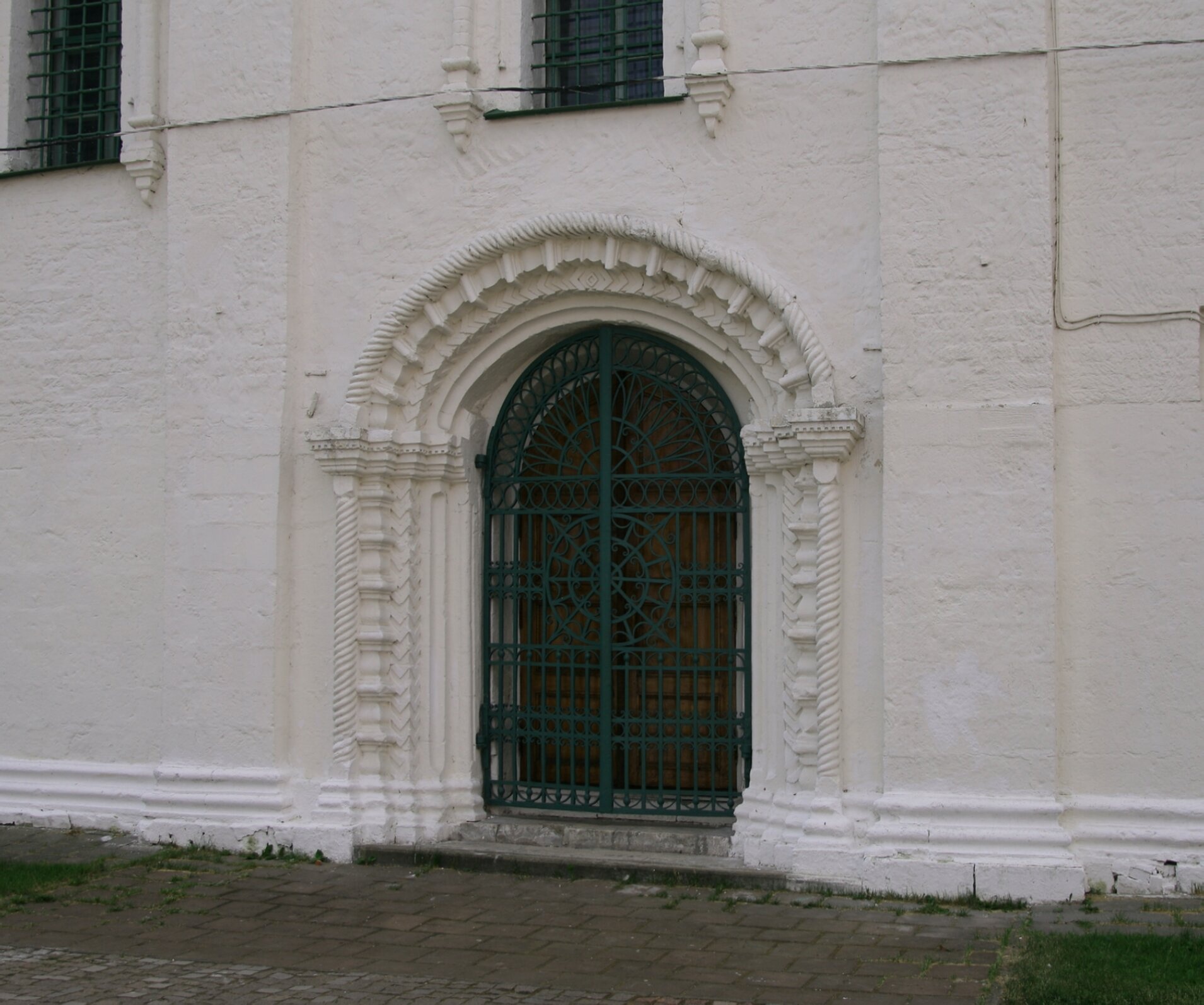 В верхней части композиции видно оконное отверстие, также защищённое решёткой аналогичного цвета и стиля. Этот портал исторически служил одним из главных входов в храм для прихожан и участвовал в торжественных богослужениях и крестных ходах, оставаясь важным элементом сакрального пространства православного собора.