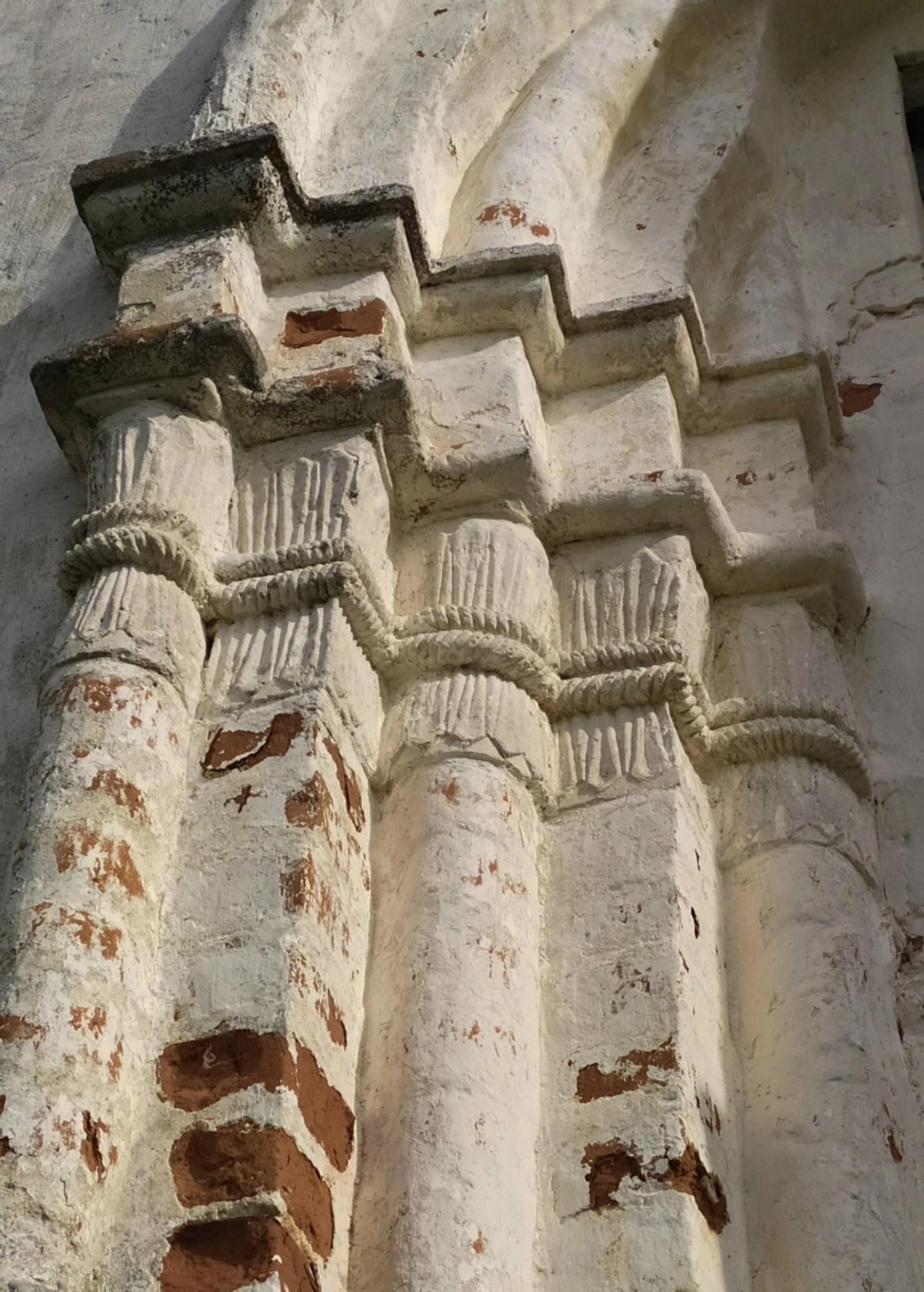 В центре композиции находятся витые колонны, украшенные рельефным орнаментом. Эти колонны выполняют не только декоративную, но и конструктивную функцию, поддерживая элементы портала. Поверхность кладки покрыта слоем штукатурки, которая местами осыпалась, обнажая кирпичную основу. Это сочетание создаёт особую фактуру, свидетельствующую о возрасте сооружения.