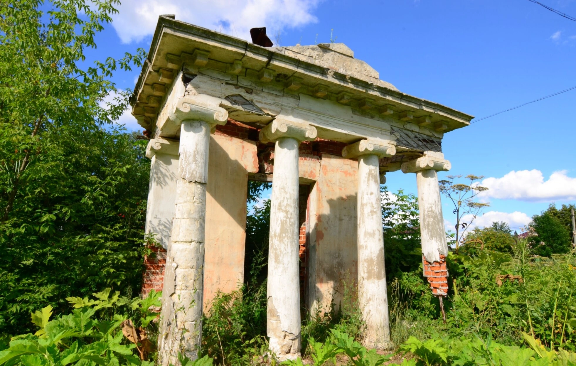 Несмотря на плачевное состояние, архитектурный образ портика сохраняет черты былого величия, напоминая о мастерстве безвестных зодчих, создавших этот храм для молитвенного предстояния пред Господом. Фотография передает глубокий контраст между совершенством богоданного таланта, воплощенного в камне, и тленностью земного бытия, что побуждает к размышлению о вечных ценностях и необходимости сохранения православного духовного наследия.
