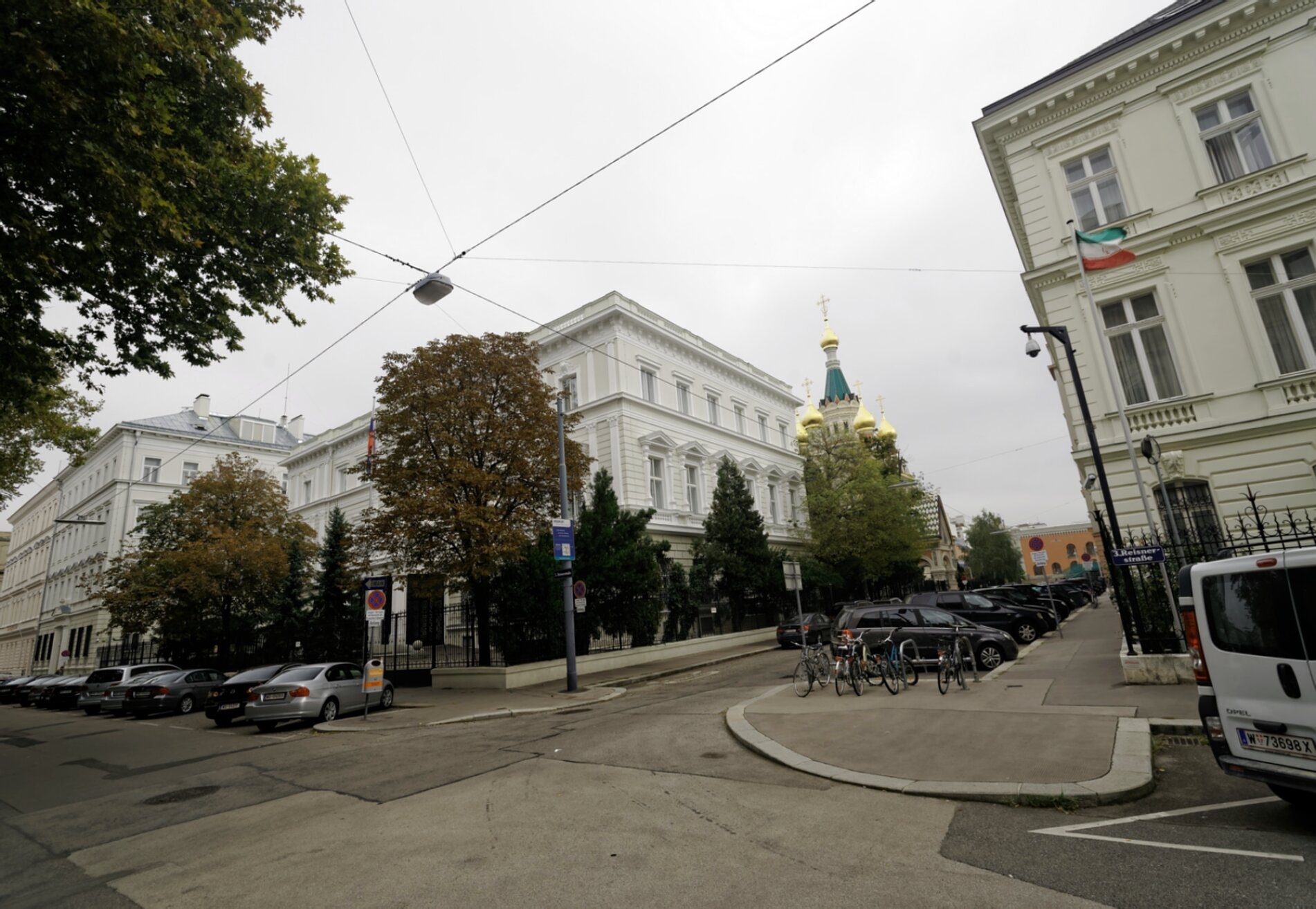 Тихая улочка с припаркованными автомобилями и деревьями в осеннем убранстве создаёт спокойную, почти камерную атмосферу вокруг этого важного государственного и духовного центра. Справа от посольства виден флаг соседнего дипломатического представительства Государства Кувейт. Весь комплекс, гармонично сочетающий дипломатическую функцию с молитвенной, служит символом присутствия России в Австрии и местом духовного окормления для православных христиан.