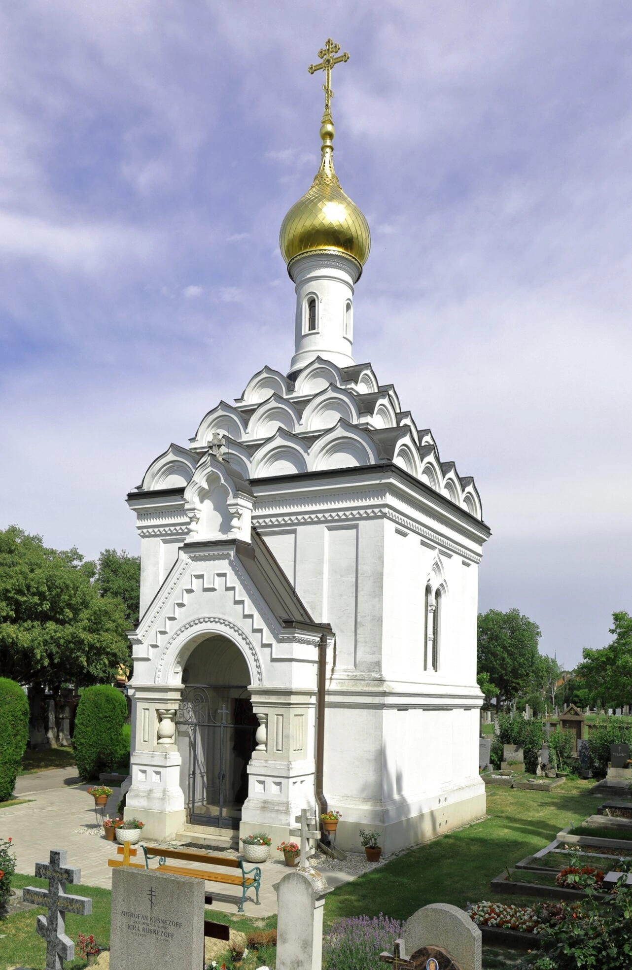На фотографии запечатлён величественный вид православного храма во имя Святого Праведного Лазаря Четверодневного, расположенного на территории Центрального кладбища в Вене. Этот храм является не только местом молитвенного поминовения усопших, но и архитектурным памятником, свидетельствующим о присутствии православной веры в сердце Европы.