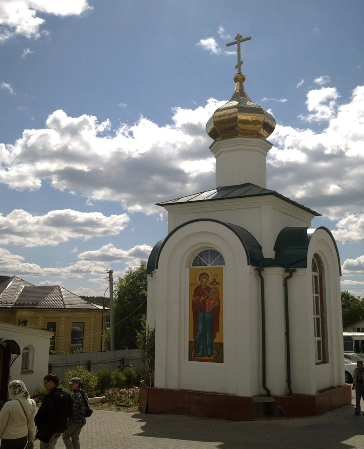 На фасаде строения чётко видна икона, предназначенная для молитвенного поклонения верующих. Часовня расположена на благоустроенной территории, окружена аккуратными дорожками, что создаёт благоговейную атмосферу для уединённой молитвы и размышлений о вечном. На заднем плане просматриваются жилые строения и кроны деревьев, что подчёркивает гармоничное сочетания святого места с мирской жизнью города.