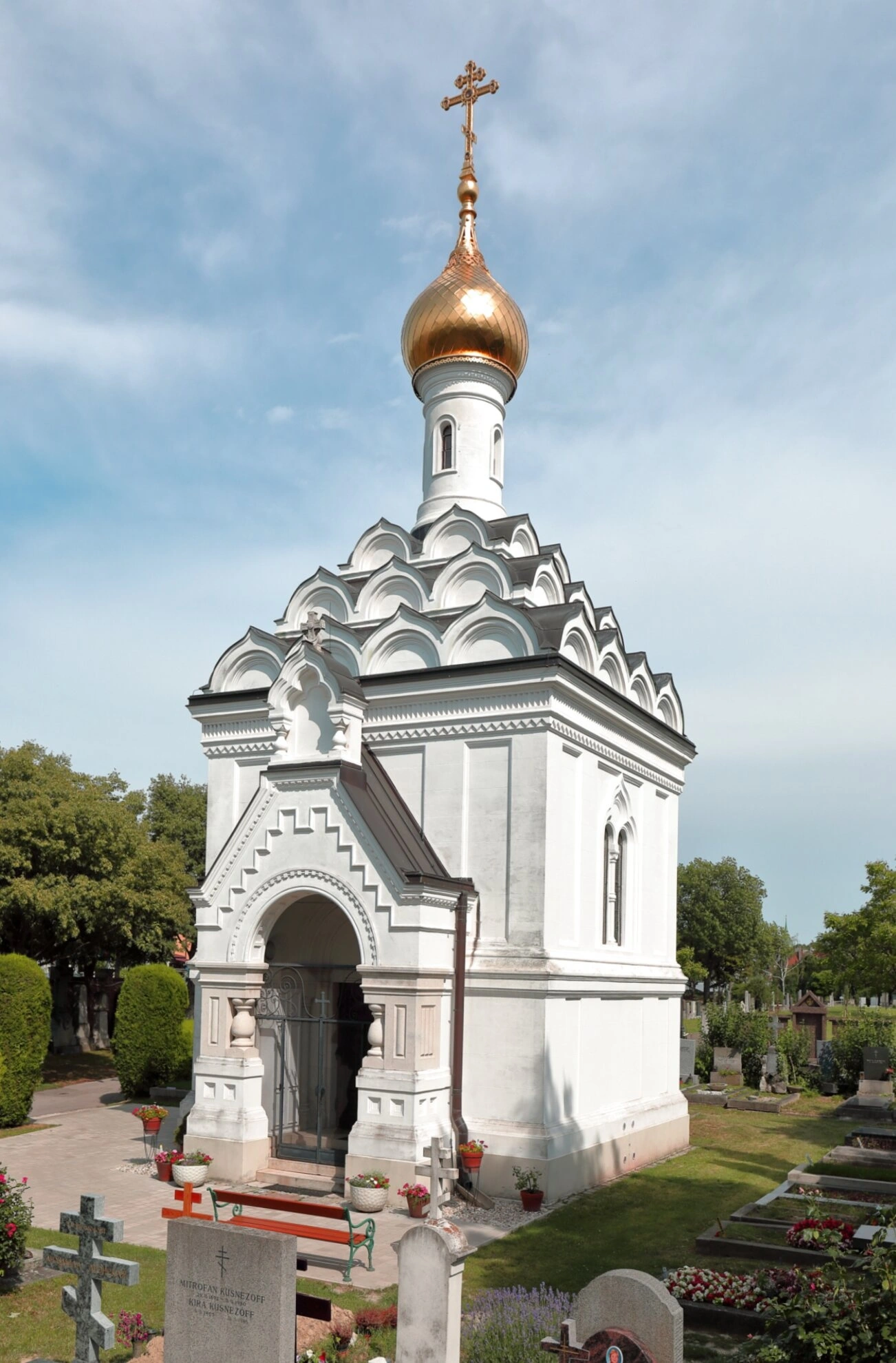 На фотографии запечатлена православная часовня во имя Святого Лазаря Четверодневного, расположенная на территории Центрального кладбища Вены (Zentralfriedhof). Это действующий храм-памятник, принадлежащий Русской Православной Церкви Заграницей и являющийся важным духовным центром для православных верующих австрийской столицы.