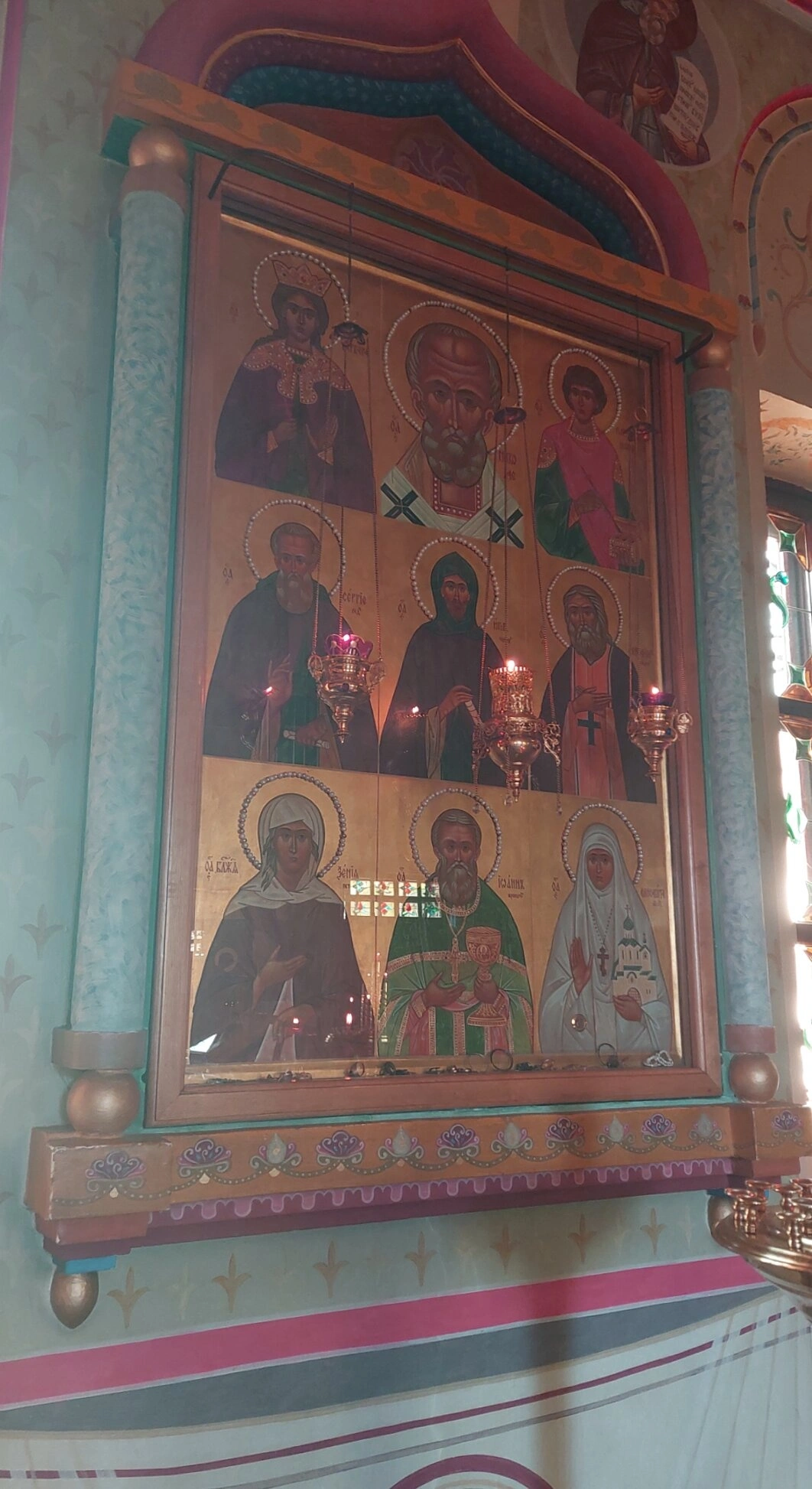 Над святыней укреплены лампады, огонь которых символизирует молитву, возносимую к Богу, и освещает лики святых мягким мерцающим светом. Дополнительное освещение поступает из оконного проема в верхней части храма, создавая эффект озарения и усиливая духовное восприятие образа. Интерьер храма, на фоне которого установлена икона, украшен настенными росписями с изображениями святых и библейских сцен, выполненными в светлой цветовой гамме, что способствует созданию атмосферы благодати и молитвенного сосредоточения.