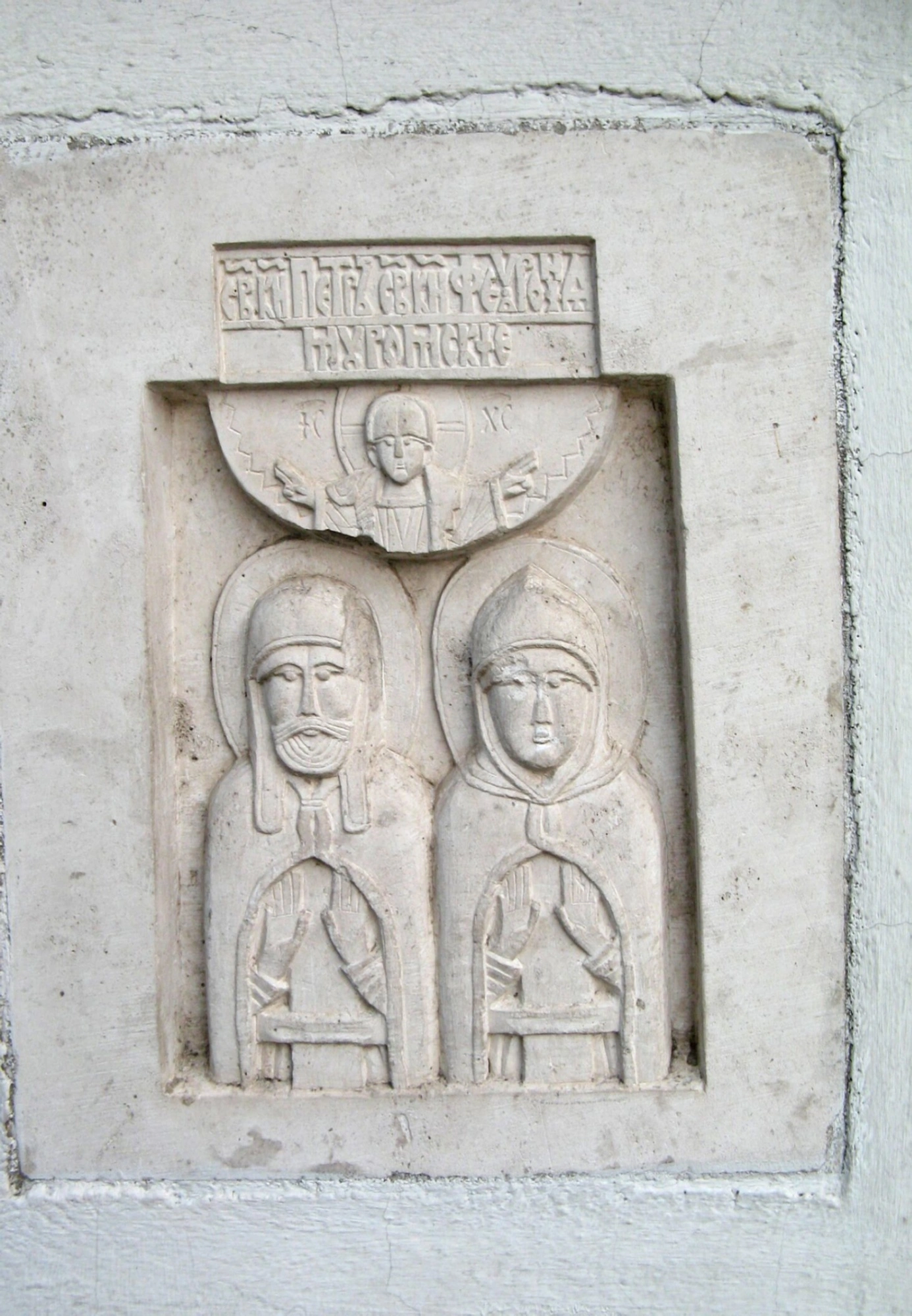 На фотографии запечатлён уникальный барельеф, расположенный на фасаде храма Малого Вознесения что на Большой Никитской улице в Москве. Данный архитектурный элемент представляет собой высокохудожественное произведение православного церковного искусства, выполненное из светлого камня или штукатурки. В центре композиции изображены две полноростные фигуры святых или царственных особ, облачённых в традиционные богатые одеяния, характерные для древнерусской иконографии. Их позы и жесты исполнены благоговения и устремлённости к небесному.