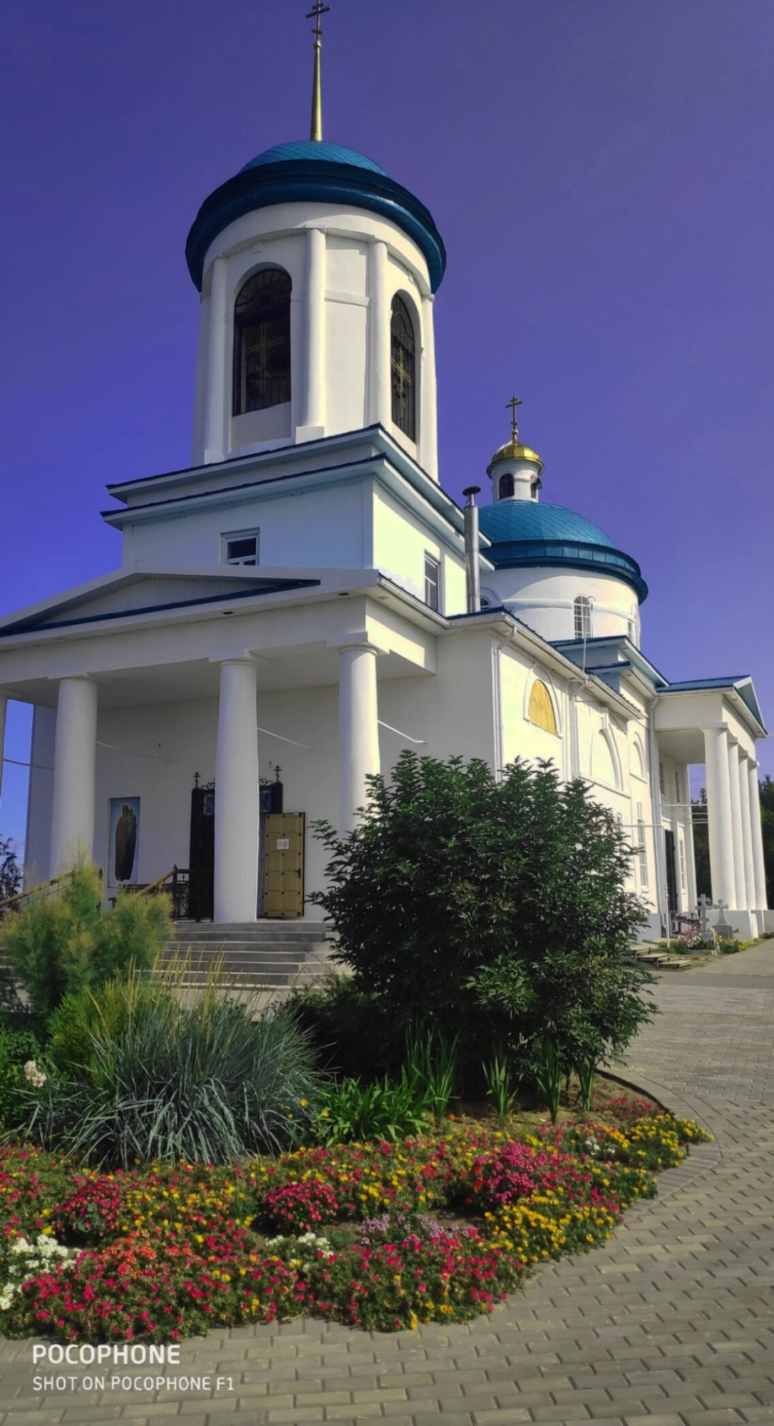 Главный фасад храма украшен монументальными колоннами, придающими входной группе особую торжественность и приветствующих паломников под свои своды. Прихрамовая территория благоустроена и ухожена: перед входом разбит живописный цветник, где пестреют розовые, оранжевые и белые цветы, обрамленные изумрудной зеленью кустарников. Эта цветущая красота символизирует райский сад и отражает попечение верующих о доме Божием.