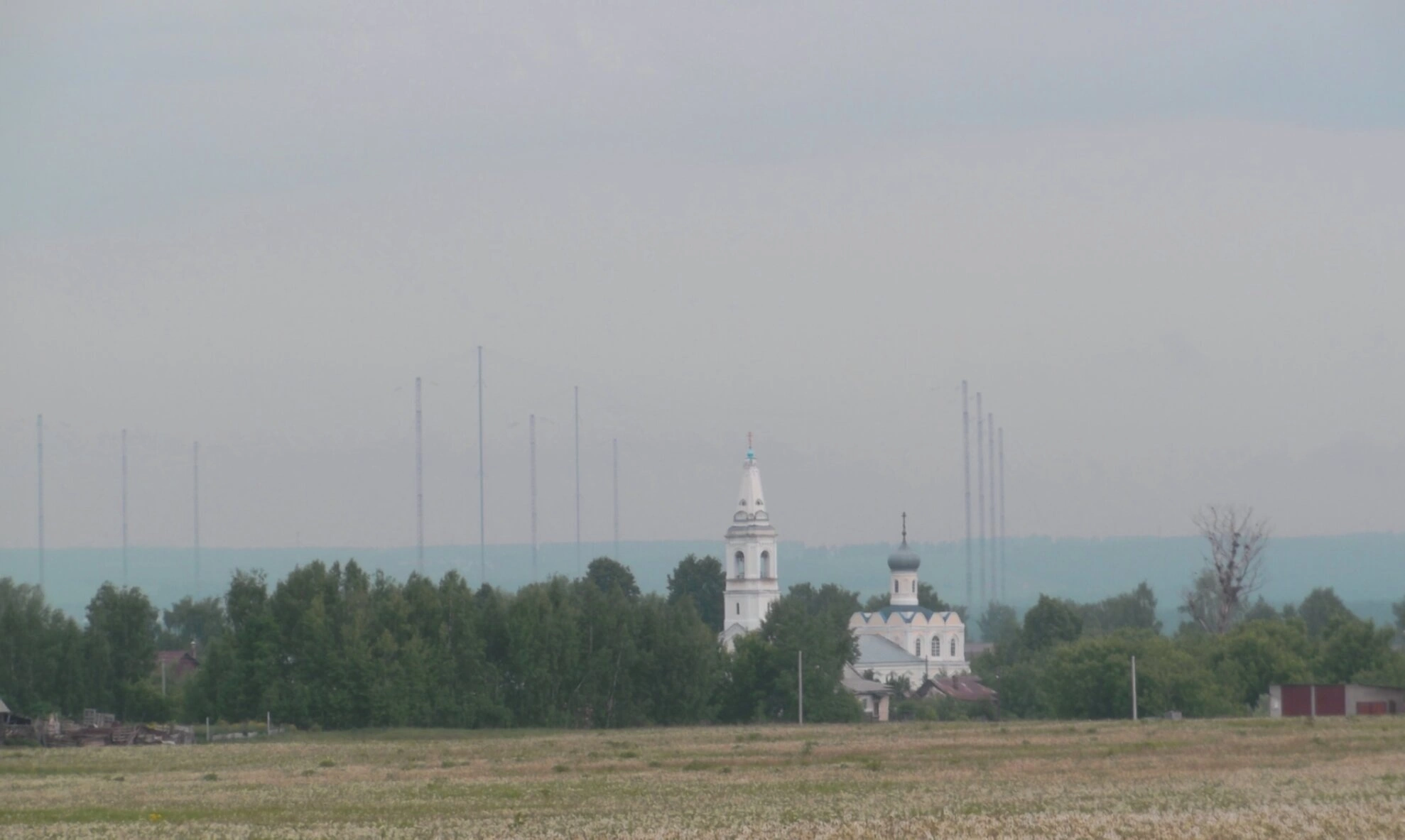 На заднем плане, у горизонта, виднеются многочисленные мачты, вероятно линии электропередач, что говорит о современном обустройстве села, которое, однако, не нарушает его традиционный патриархальный уклад. Общий вид под пасмурным небом придаёт пейзажу особую глубину и лиричность, напоминая о вечных ценностях и неразрывной связи человека, веры и природы.