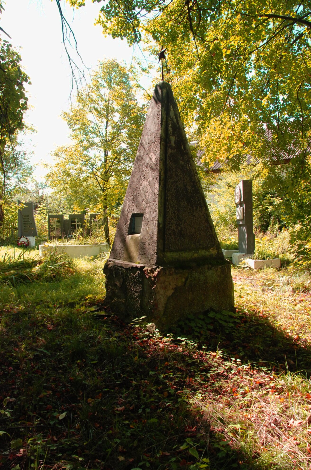 Окружающая природа – густая трава и тенистые деревья – создает естественный благообразный фон для этого памятника, подчеркивая его духовное значение и связь с вечностью. Место упокоения, где установлен обелиск, сохраняет атмосферу молитвенной памяти и тишины, свойственную православным некрополям.