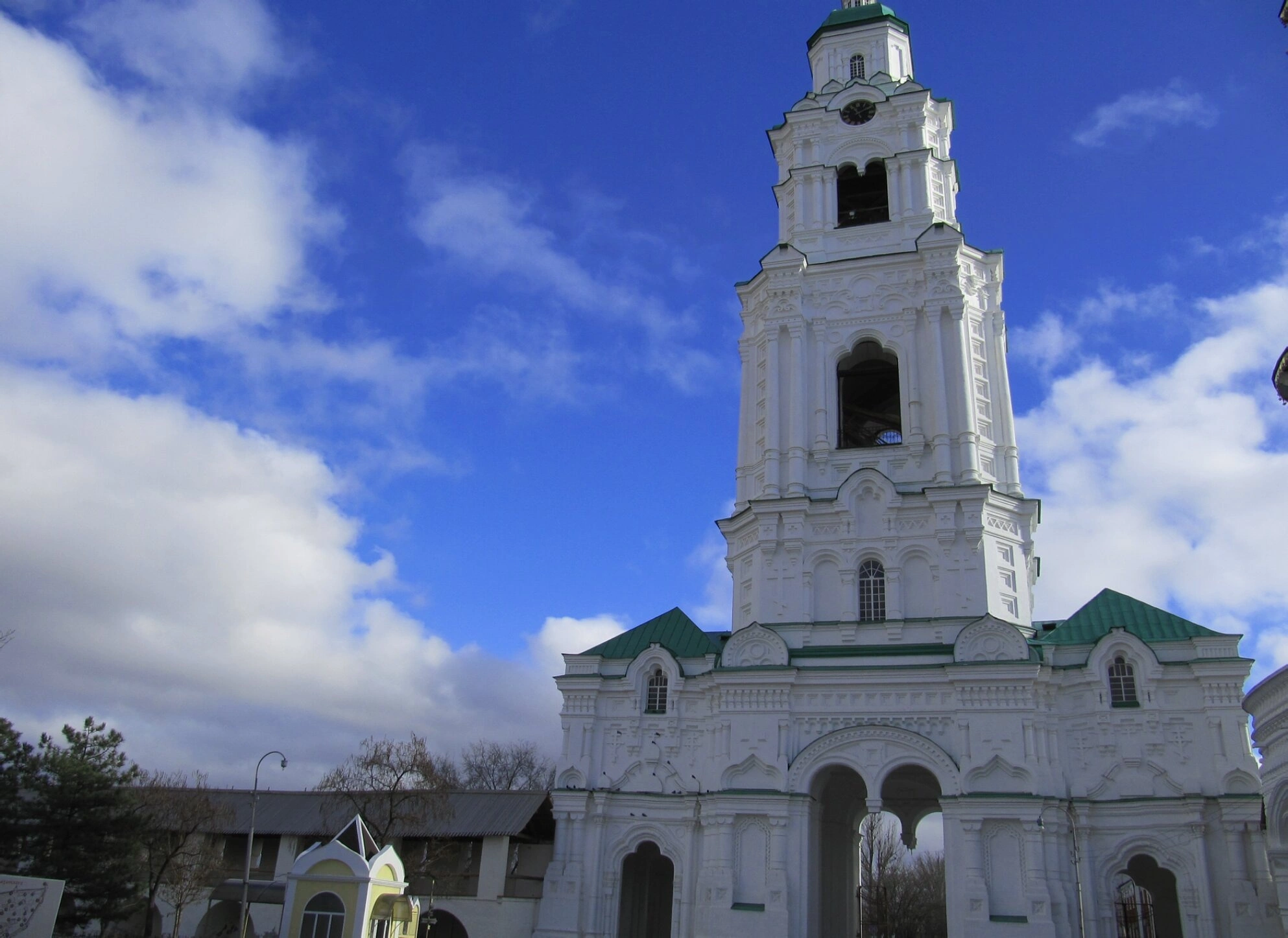 На представленной фотографии запечатлена Пречистенская надвратная колокольня – величественное сооружение, являющееся частью ансамбля Успенского собора Астраханского кремля. Это монументальное строение служит главным входом на территорию древней крепости и представляет собой выдающийся памятник церковной архитектуры.