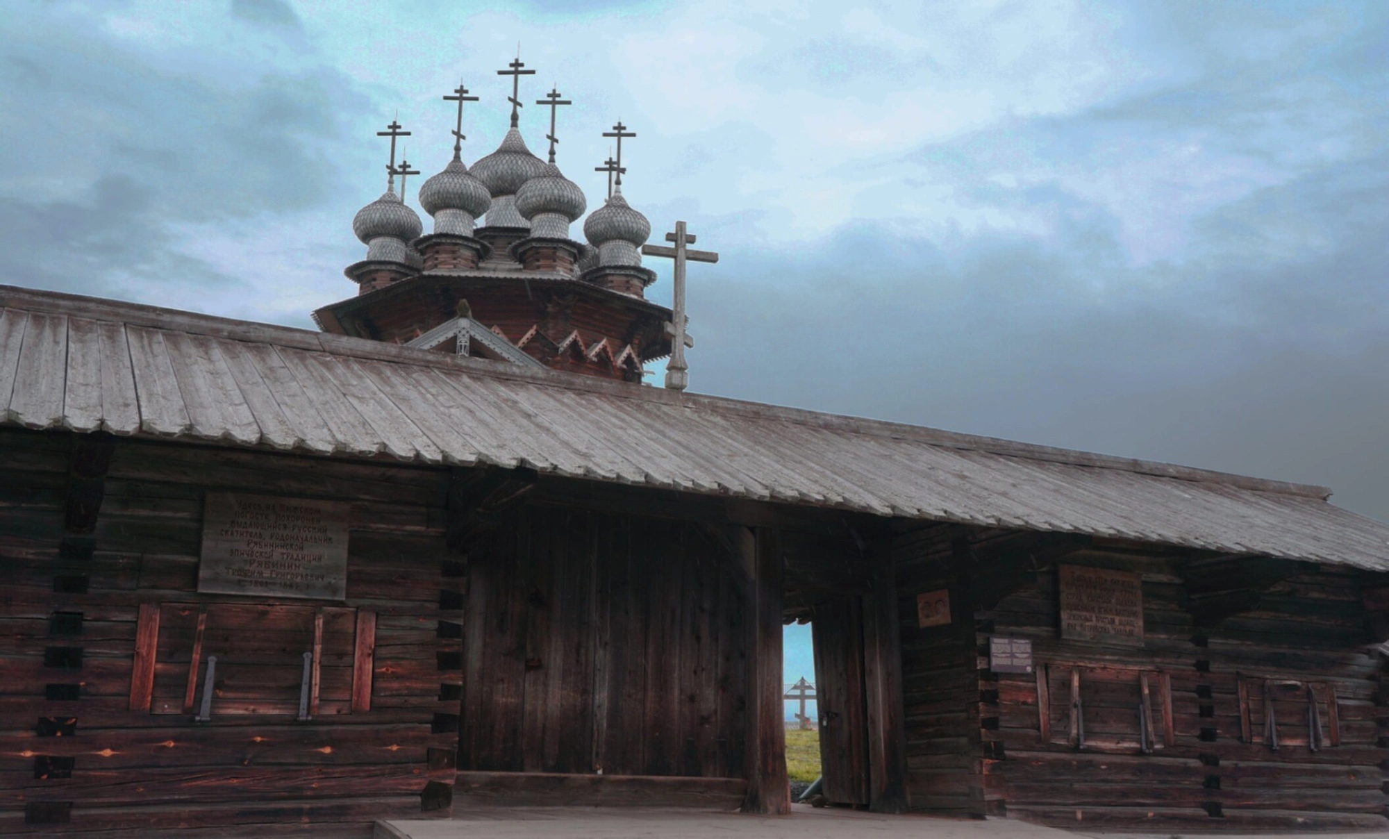На представленной фотографии запечатлена часть деревянной входной группы Преображенской церкви на острове Кижи. Массивная конструкция из горизонтально уложенных тёмных брёвен, покрытая деревянной черепицей, ведёт во внутреннее пространство погоста. Над ней возвышаются серебристо-серые купола храма, увенчанные православными крестами. Тяжёлые облака создают приглушённое освещение, подчёркивая величие и древность этого священного места.