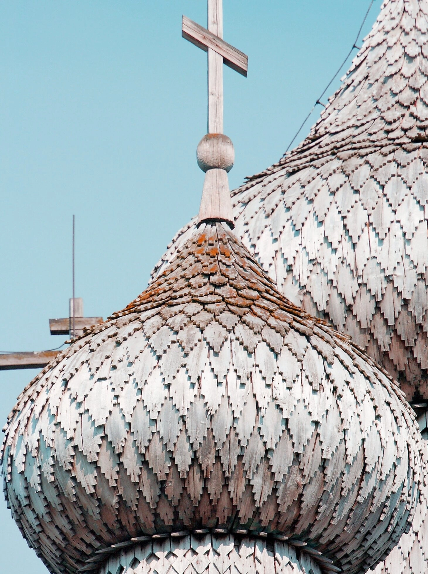 На представленной фотографии запечатлён фрагмент главного храма Кижского погоста – церкви Преображения Господня. Изображение крупным планом раскрывает тончайшие детали её знаменитых луковичных глав, покрытых традиционным деревянным лемехом. Серебристо-серый оттенок осиновых пластин, выгоревших под северным солнцем и намокших от дождей, создаёт неповторимый образ этого величественного сооружения.