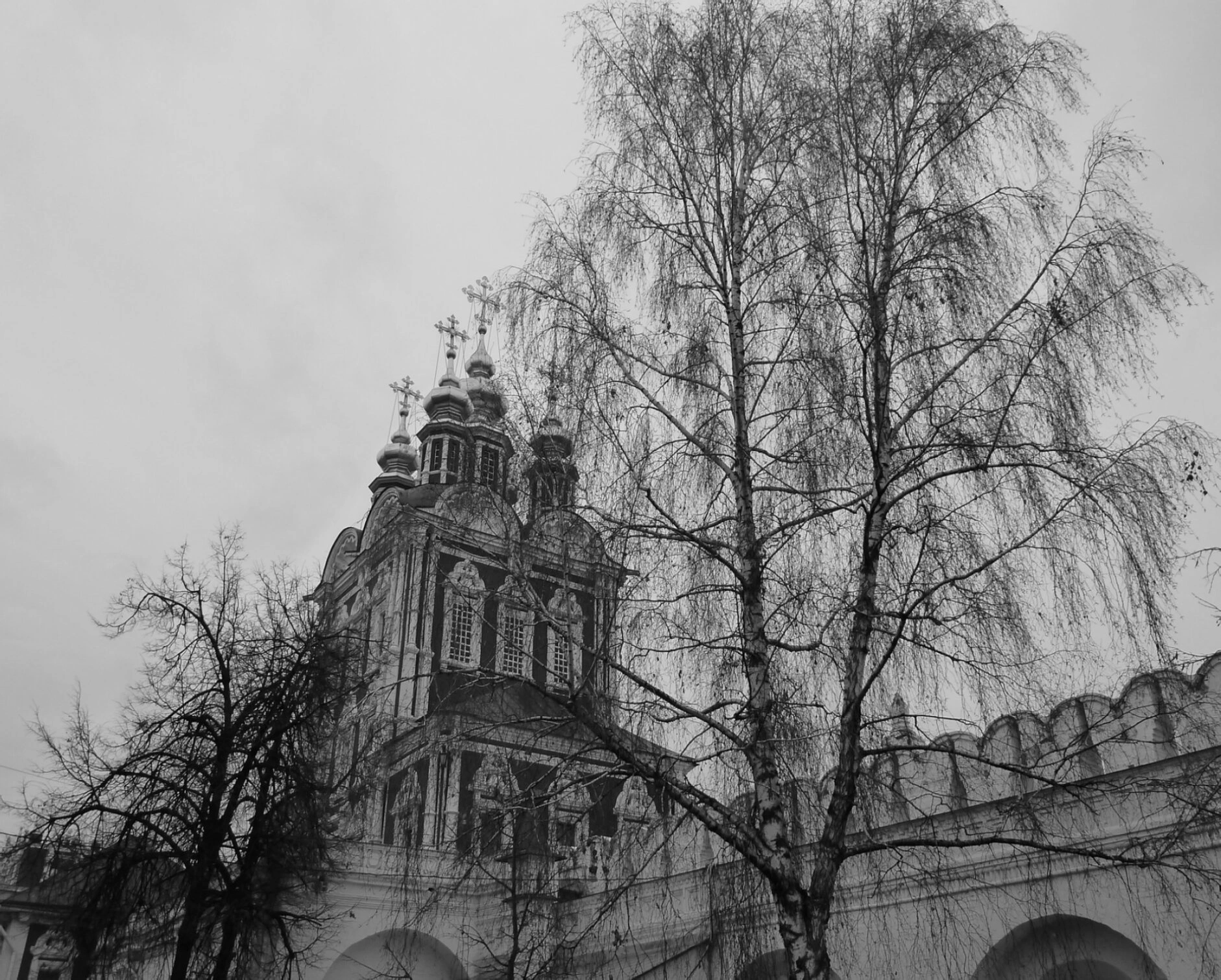 На представленном чёрно-белом изображении запечатлена Преображенская церковь, возвышающаяся над северными святыми воротами Новодевичьего монастыря в Москве. Храм освящён в честь Преображения Господня и является неотъемлемой частью архитектурного ансамбля одной из главных православных обителей России.