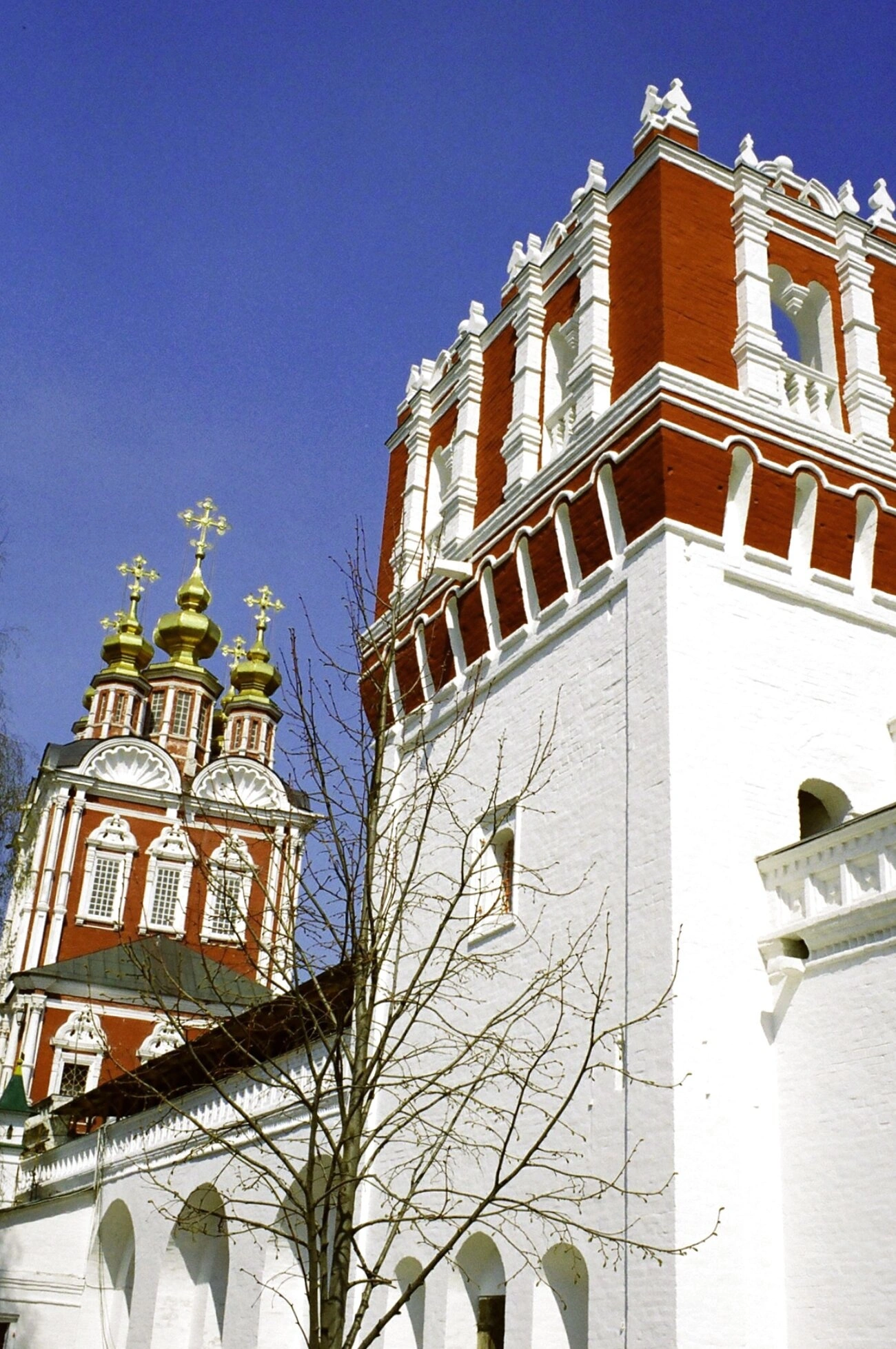 На переднем плане фотографии видны ветви дерева, лишённые лиственного покрова, что позволяет предположить, что съёмка проводилась в межсезонье - ранней весной или поздней осенью. Изображение передаёт благолепие православной святыни, являющейся неотъемлемой частью ансамбля Новодевичьей обители, имеющей особое значение в духовной жизни Москвы.