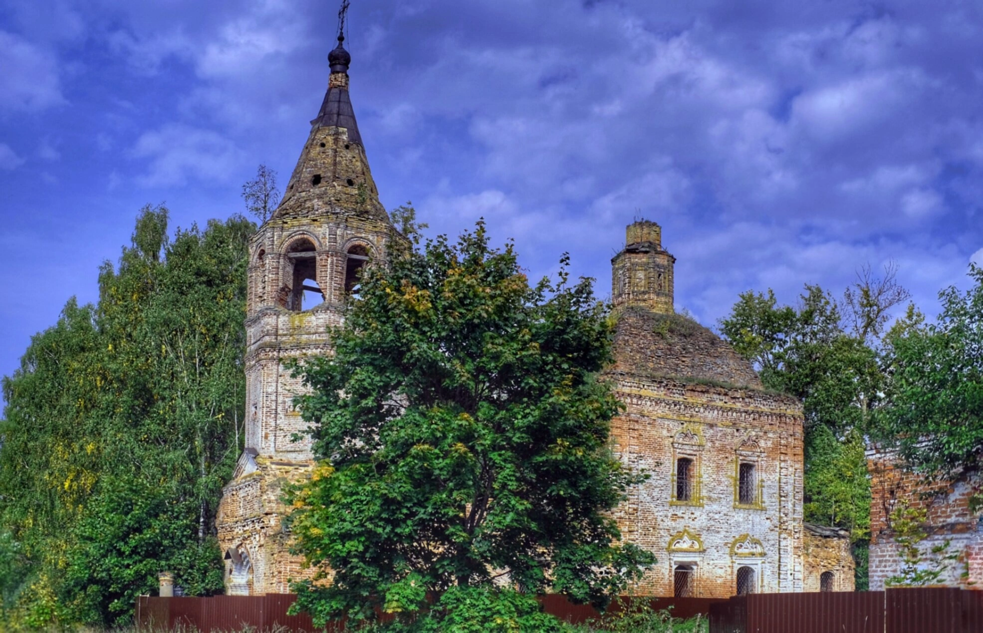 На представленной фотографии запечатлена Преображенская летняя церковь, расположенная в селе Обезово Владимирской области. Этот православный храм, освящённый в честь Преображения Господня, был возведён в 1801 году и представляет собой значительный памятник церковной архитектуры начала XIX века.