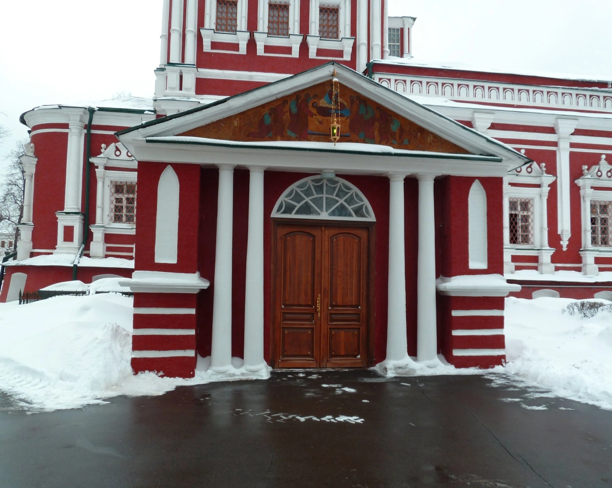 Фотография сделана в зимний период, о чем свидетельствует снежный покров, окружающий храм. Расчищенная дорожка перед входом указывает на то, что в обители продолжается молитвенная жизнь независимо от времени года. Отсутствие людей на снимке позволяет в полной мере сосредоточиться на архитектурных достоинствах этого уникального памятника церковного зодчества конца XVII века, который продолжает служить украшением православной Москвы и местом молитвенного предстояния верующих.