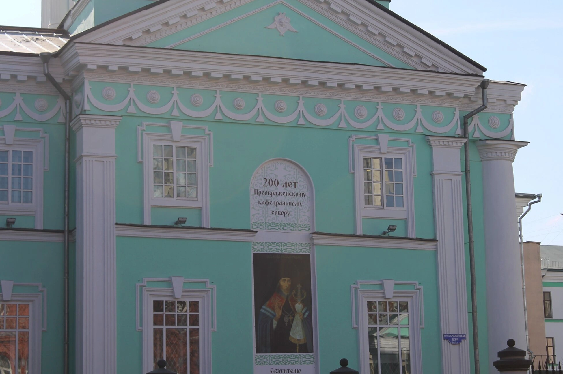 Здание собора, окрашенное в благолепный бирюзовый цвет, символизирующий небесную чистоту и благодать, украшено белоснежными архитектурными элементами и лепным декором. На фасаде чётко просматриваются арочные оконные проёмы, пилястры и колонны, придающие облику храма торжественность и строгость. В центральной части фасада размещён памятный баннер, возвещающий о 200-летии освящения собора, с изображением чтимой иконы.
