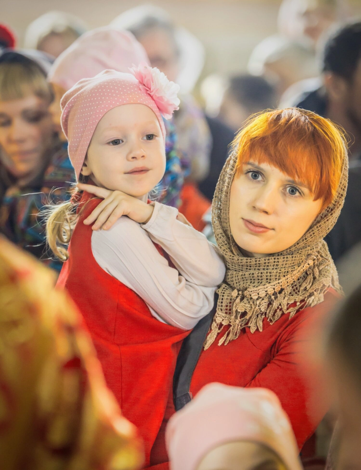 В центре композиции — благочестивая прихожанка в красном платке и малолетняя дочь её, облачённая в розовую шапочку. Отроковица покоится на руках матери, и взоры их устремлены в одну сторону, вероятно, к алтарю или праздничной иконе, выражая тем самым общую сосредоточенность на молитве и богослужебном действии. Их благочестивые лики отражают мир и тихую радость сопричастности к церковным таинствам.
