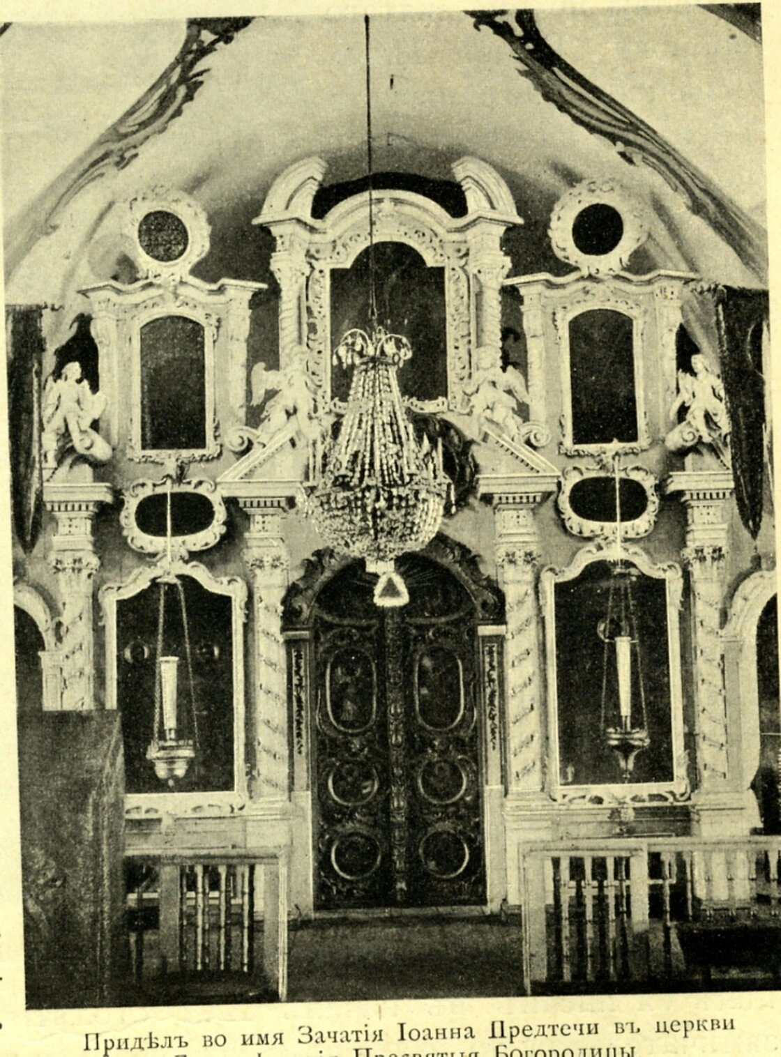 На фотографии запечатлён интерьер придела во имя Зачатия честного славного пророка и предтечи Господня Иоанна в Благовещенской церкви Пресвятой Богородицы на Васильевском острове Санкт-Петербурга. Придел расположен на хорах верхнего храма и освящён 15 августа 1763 года.