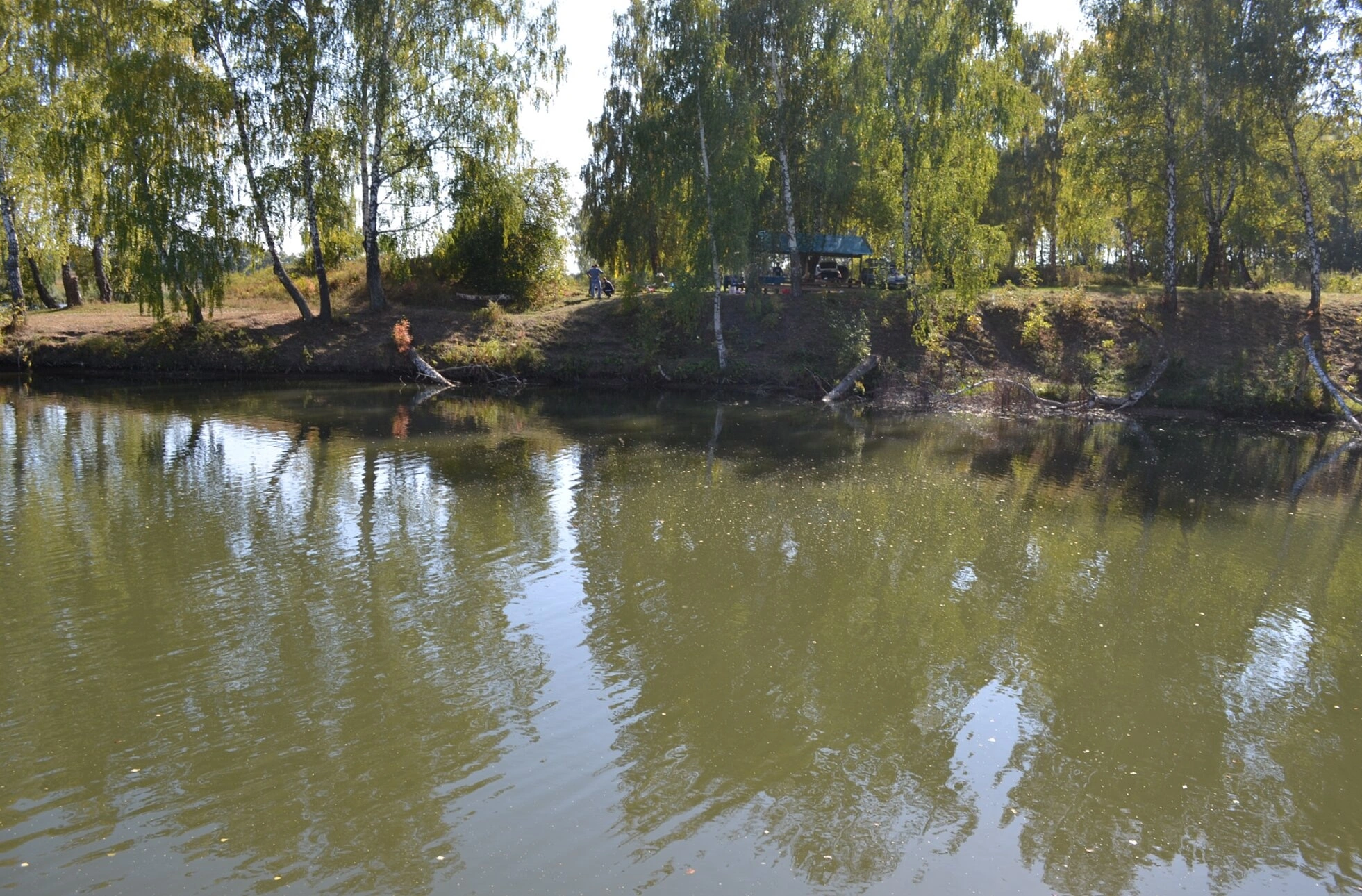 В центре композиции изображён водоём, в спокойных водах которого отражается окружающая природа – деревья, произрастающие на берегу. На заднем плане видна архитектурная форма, напоминающая беседку или навес, характерную для благоустроенных территорий при православных храмах. Подобные сооружения часто служат для отдыха паломников и прихожан после совершения молитв.