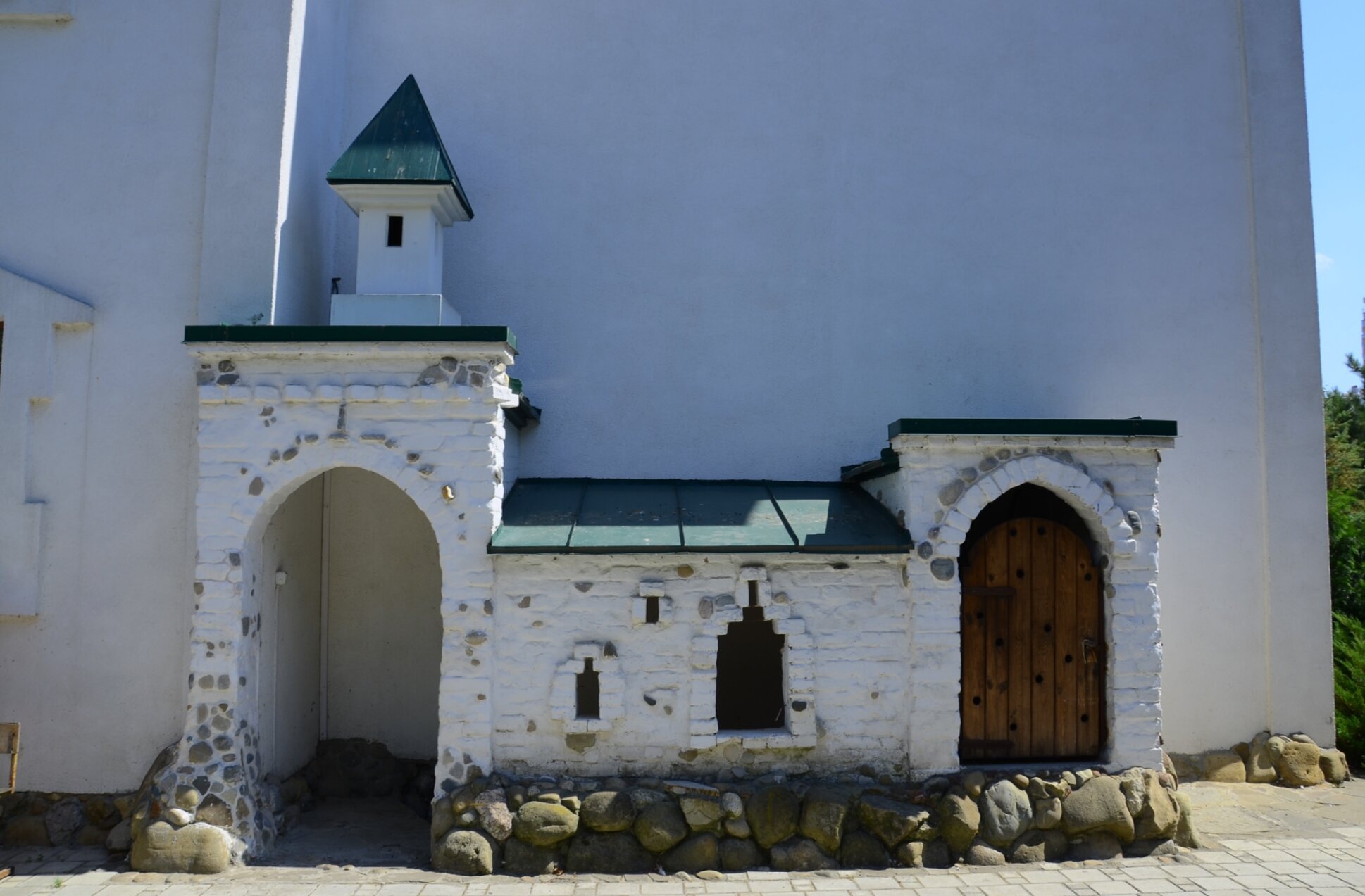 Основание постройки выложено массивными округлыми камнями, формирующими эффект древней кладки и символизирующими прочность духовных основ. В левой части сооружения расположен арочный проход, ведущий в притвор, а справа находится деревянная дверь, увенчанная стрельчатой аркой – традиционный элемент церковной архитектуры.