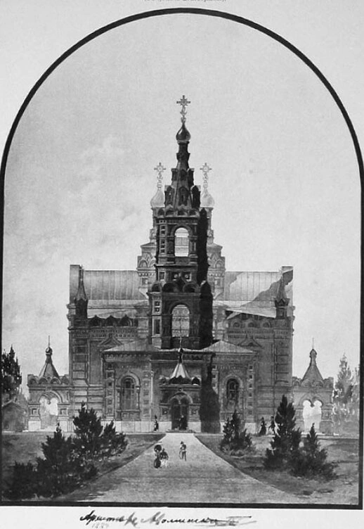 На представленном изображении запечатлен архитектурный проект Преображенского кафедрального собора в Иваново-Вознесенске, созданный выдающимся московским зодчим Александром Степановичем Каминским. Храм был возведён в 1889-1893 годах на средства известного фабриканта Мефодия Никоновича Гарелина и освящён 24 августа 1893 года архиепископом Владимирским и Суздальским Сергием (Спасским).