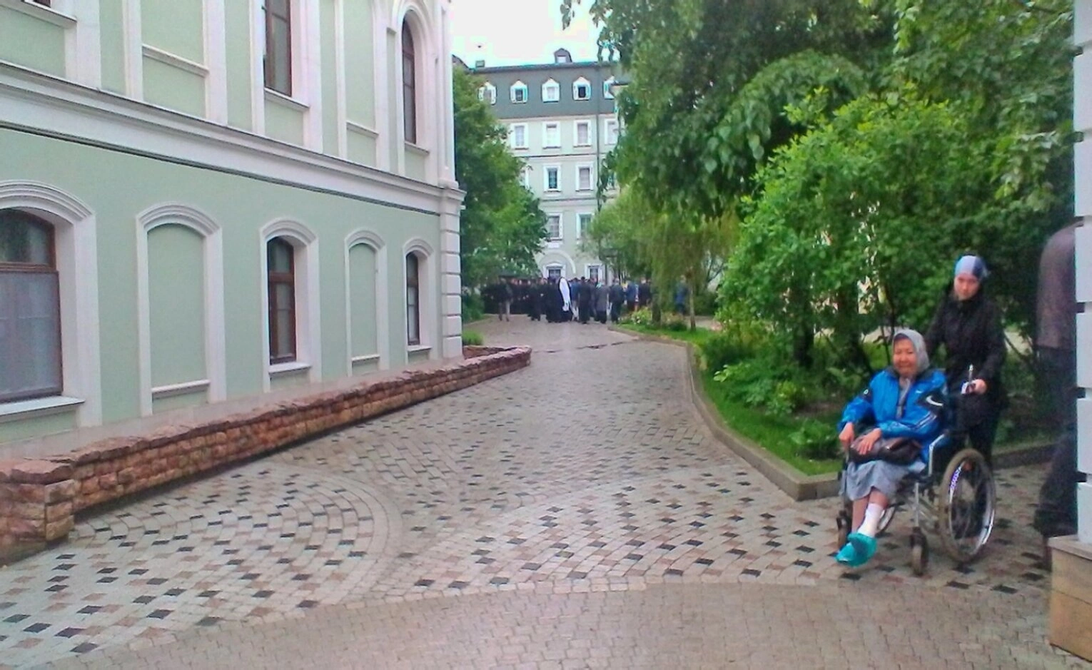 Архитектурный ансамбль монастыря служит величественным фоном происходящего. Слева виден фадел братского корпуса или иного монастырского здания, характерного для русской церковной архитектуры. Его светлые стены и арочные оконные проёмы создают ощущение благодати и небесного света. Справа виднеется зелёная растительность, ухоженные деревья и кустарники, что добавляет кадру умиротворения и гармонии с божьим творением.