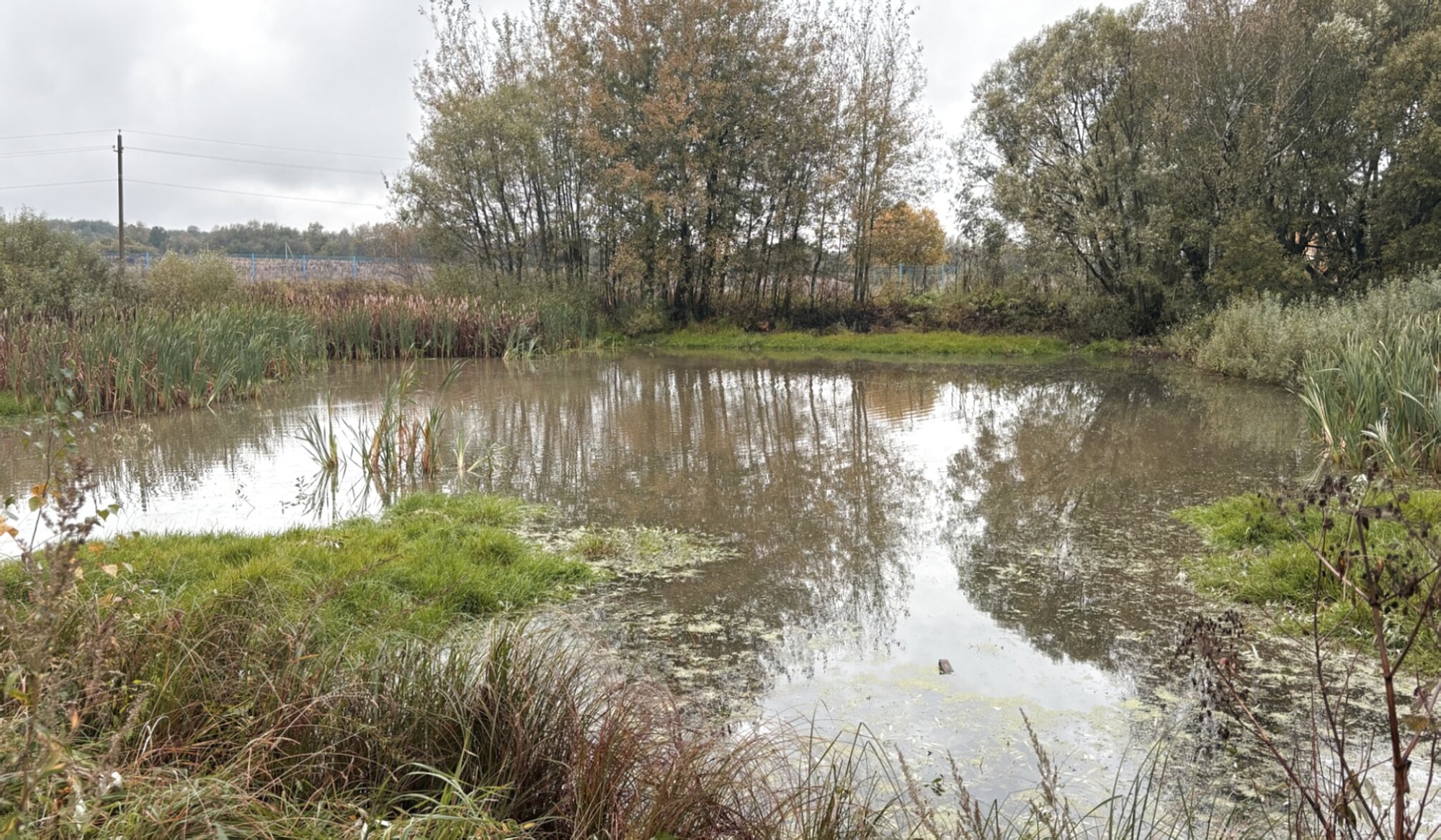 Поверхность водоёма частично покрыта ряской, что свидетельствует о естественном состоянии экосистемы. В мутноватых водах пруда нашли своё отражение кроны деревьев и пасмурное осеннее небо, создавая своеобразную природную икону, где земное встречается с небесным. По берегам обильно произрастают камыши и высокая трава, обрамляя водную гладь естественным растительным окладом.