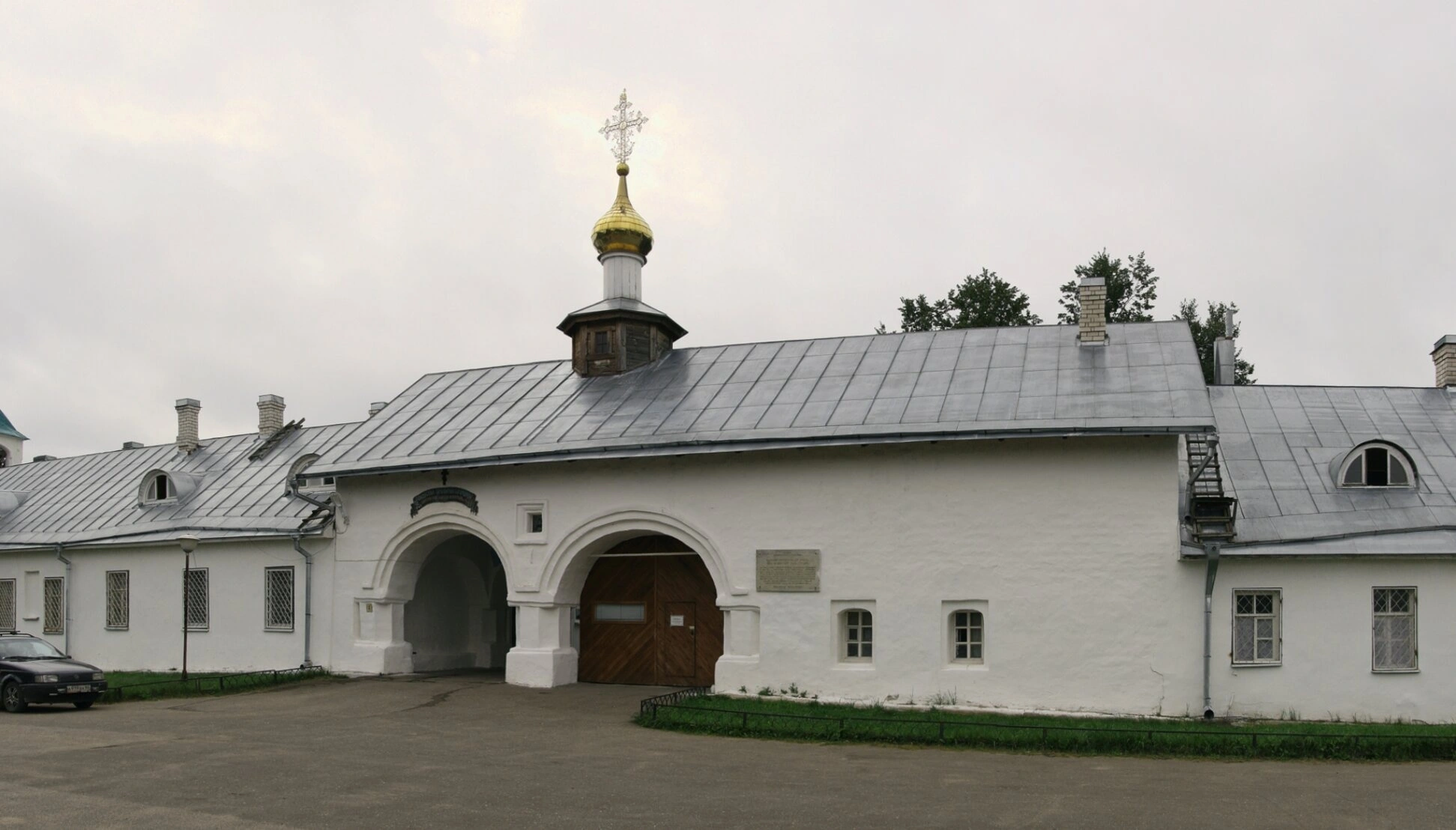 На фотографии отчетливо видна монументальная каменная кладка, характерная для псковской архитектурной школы. Надвратный храм, изображенный на снимке, является не только важным элементом монастырского ансамбля, но и выполняет духовную функцию — освящает путь всякому входящему в святую обитель. Его купол, устремленный в небеса, символизирует молитву и духовное горение.