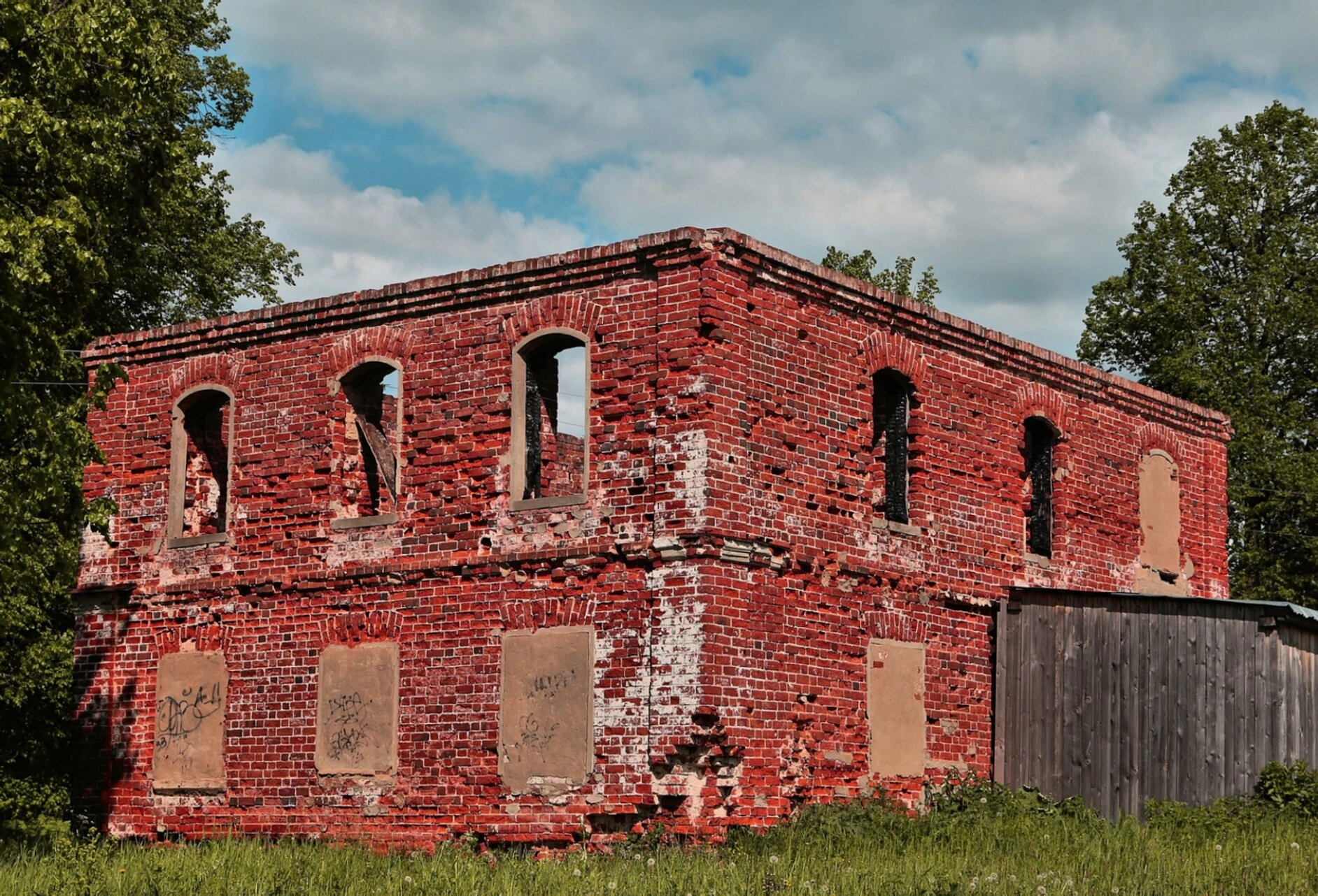На представленной фотографии запечатлена полуразрушенная Пятницкая церковь, расположенная в деревне Морозово Тейковского района Ивановской области. Храм, освящённый в честь святой великомученицы Параскевы Пятницы, представляет собой двухэтажное кирпичное здание, выполненное в традициях русской церковной архитектуры.