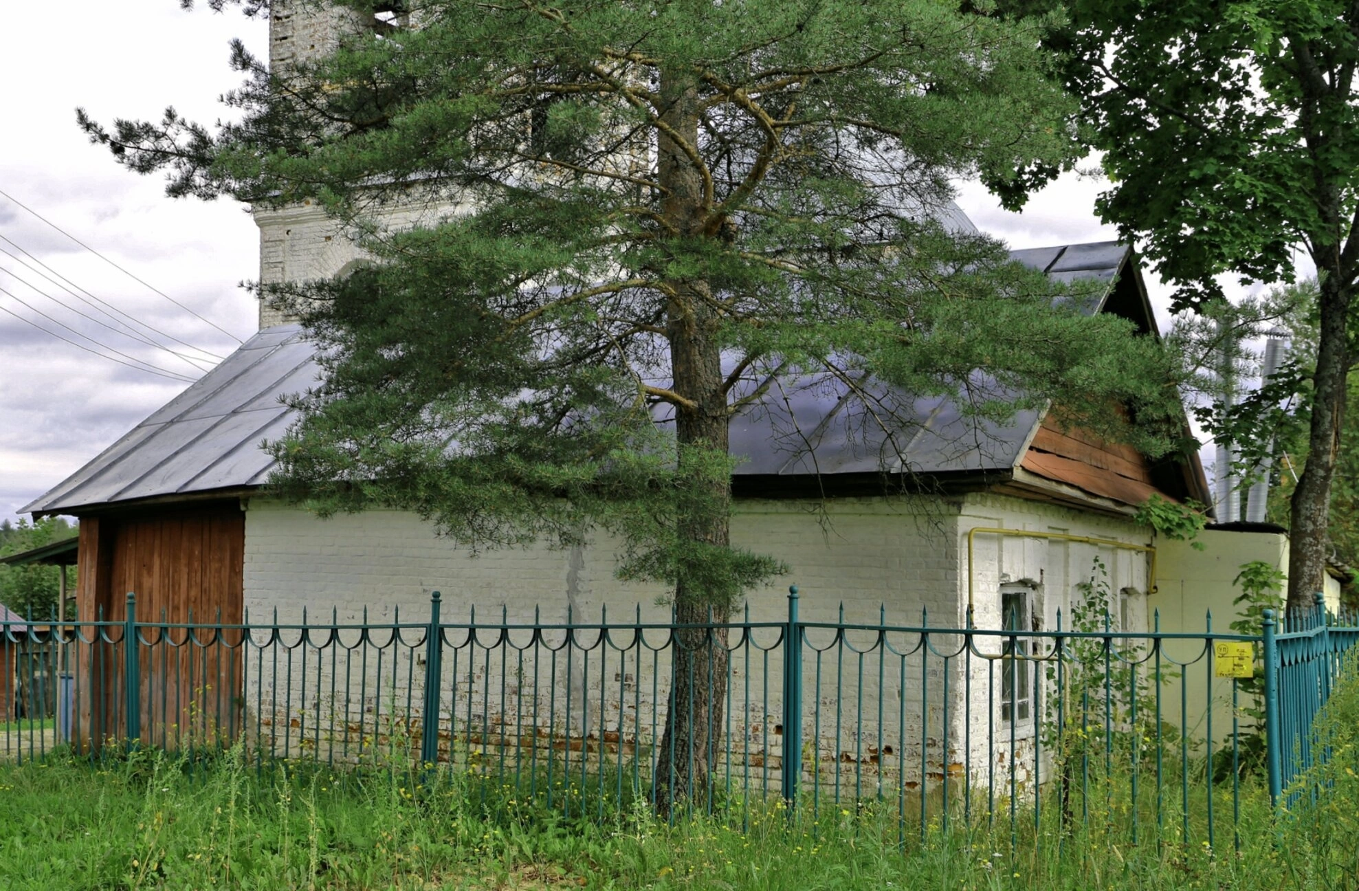 На переднем плане фотографии изображено большое хвойное дерево, частично закрывающее фасад здания, а также высокая трава, что создаёт естественное обрамление архитектурного памятника. Справа от церкви видны другие деревья, формирующие природное окружение храма. Задний план композиции завершается изображением пасмурного неба, придающего снимку особую атмосферу.