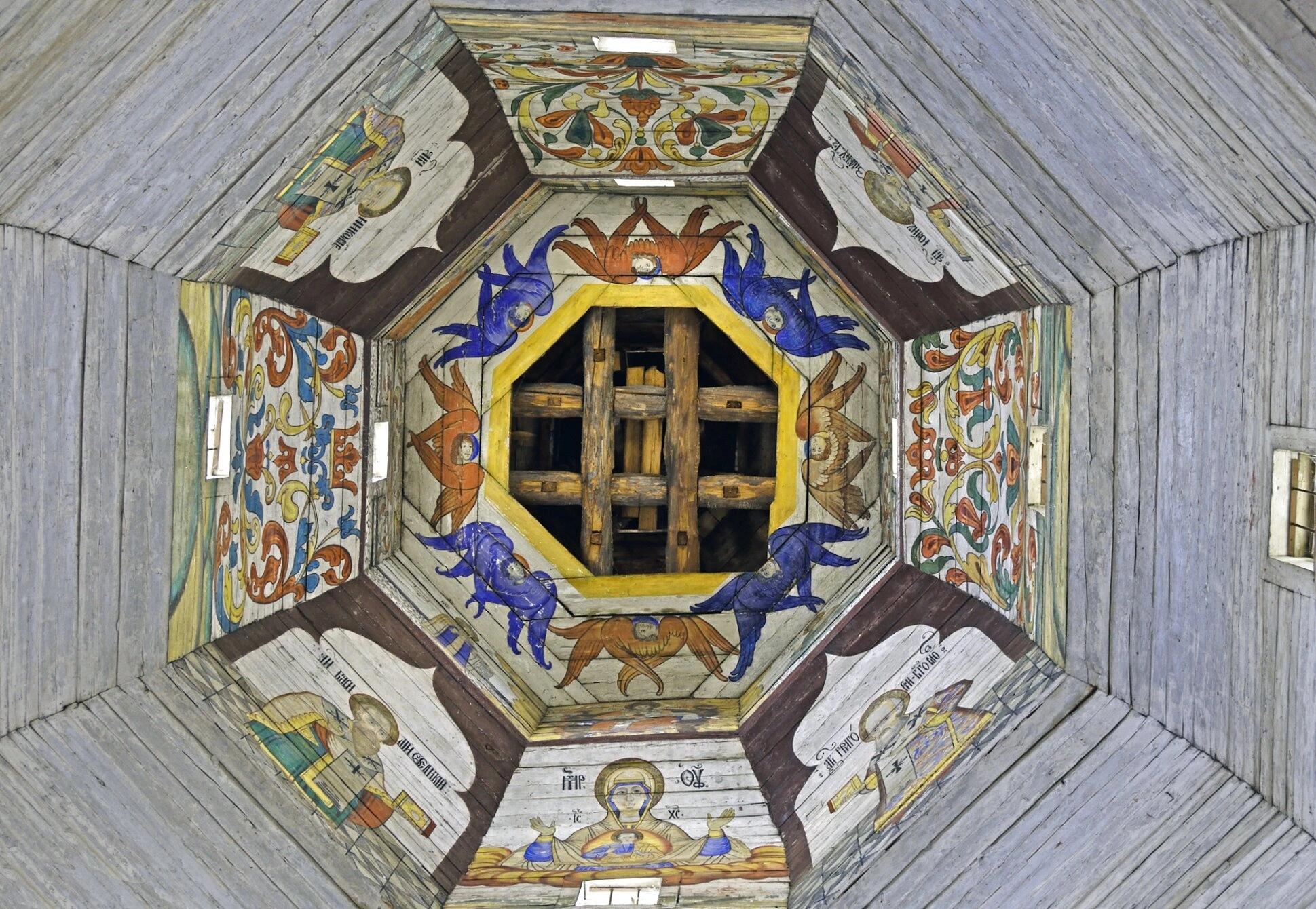 На представленной фотографии запечатлён уникальный памятник русского православного искусства — расписной потолок-«небо» деревянной церкви Тихвинской иконы Божией Матери, расположенной в древнем городе Торжке Тверской области. Храм является выдающимся образцом северного деревянного зодчества и обладает особой духовной значимостью.