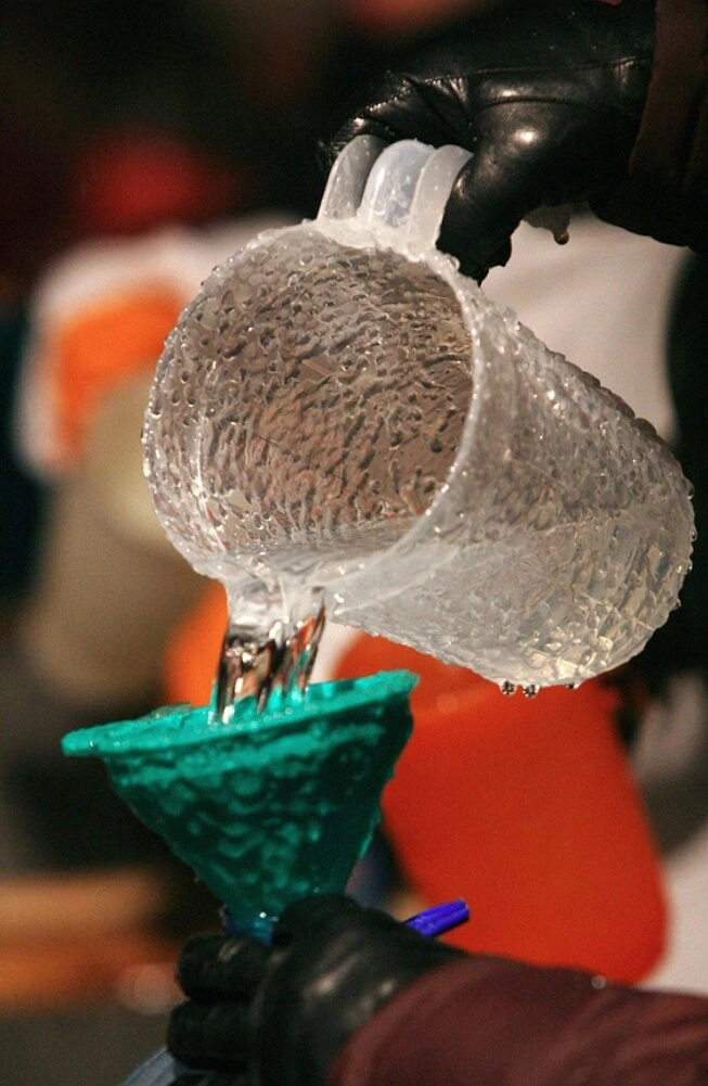 На фотографии запечатлён значимый момент церковного таинства — раздача великой агиасмы, освящённой крещенской воды, в соборе святого благоверного князя Александра Невского, что в Новосибирске. Священнослужитель или прислуживающий в храме, облачённый в тёмные перчатки, совершает переливание святой воды из прозрачного стеклянного сосуда через бирюзовую воронку. Данное действие происходит в дни празднования Богоявления, когда вся полнота Православной Церкви с благоговением приступает к принятию воды, освящённой особым чином, с молитвой и верой в её благодатную силу.