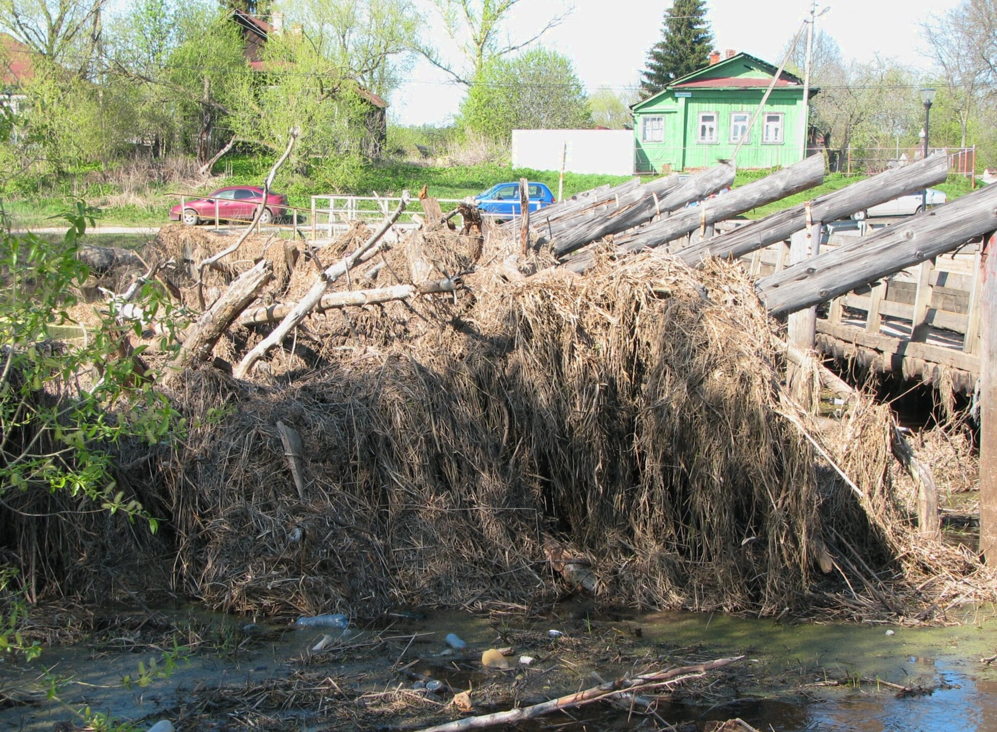 На представленной фотографии запечатлён вид на реку Тёзу в историческом посёлке Холуй, что в Ивановской области. На переднем плане изображён разрушенный временем деревянный мост либо остатки плотины, сквозь которые пробивается вода. Конструкция основательно заросла и загромождена природным мусором — стволами деревьев и речными наносами, что создаёт впечатление заброшенности и своеобразного природного возрождения.