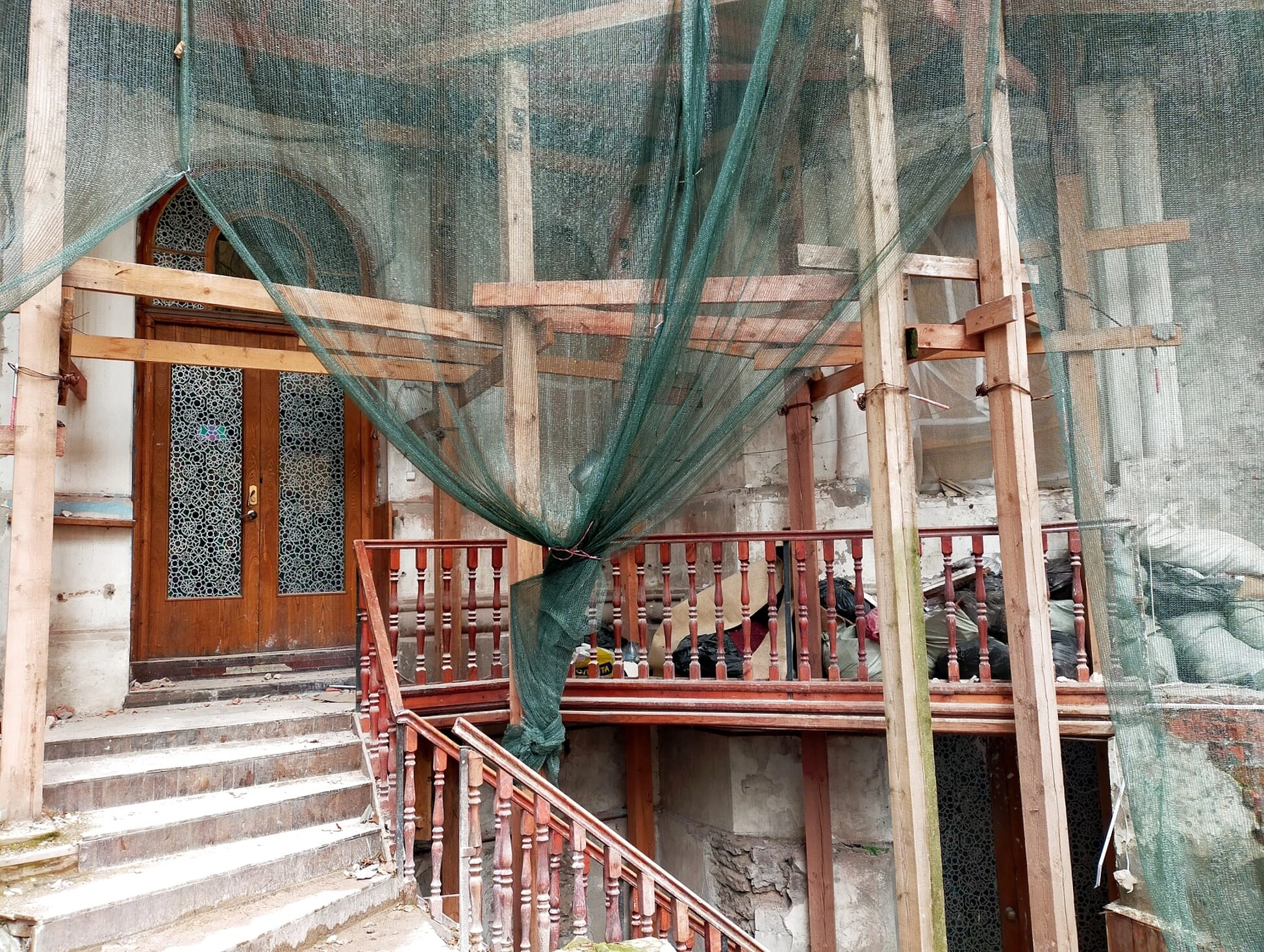 В центре композиции — старинное деревянное крыльцо с арочным оконным проёмом над входной дверью, украшенной благочестивыми узорами. Дверь, ведущая в дом молитвы, временно закрыта для прихожан, но вскоре вновь распахнётся после завершения всех работ. Деревянные леса и зелёная защитная сетка, окутавшие фасад, являются неотъемлемой частью процесса бережного сохранения духовного и архитектурного наследия.