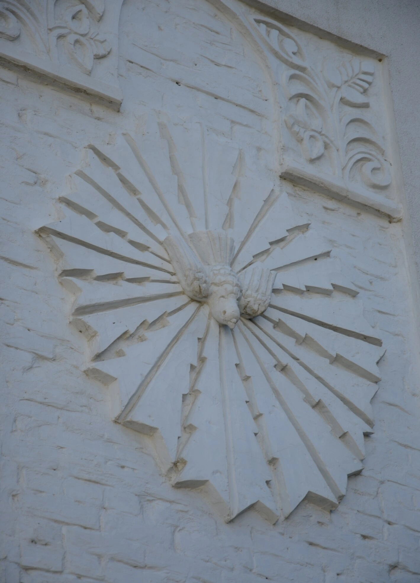 Объемное рельефное изображение выполнено с высоким художественным мастерством. Небесный голубь окружен сиянием рельефных лучей, образующих нимб вокруг птицы. Лучи имеют четкие геометрические формы и создают эффект божественного света, исходящего от Святого Духа. Вся композиция выдержана в традициях православной церковной архитектуры и символики.