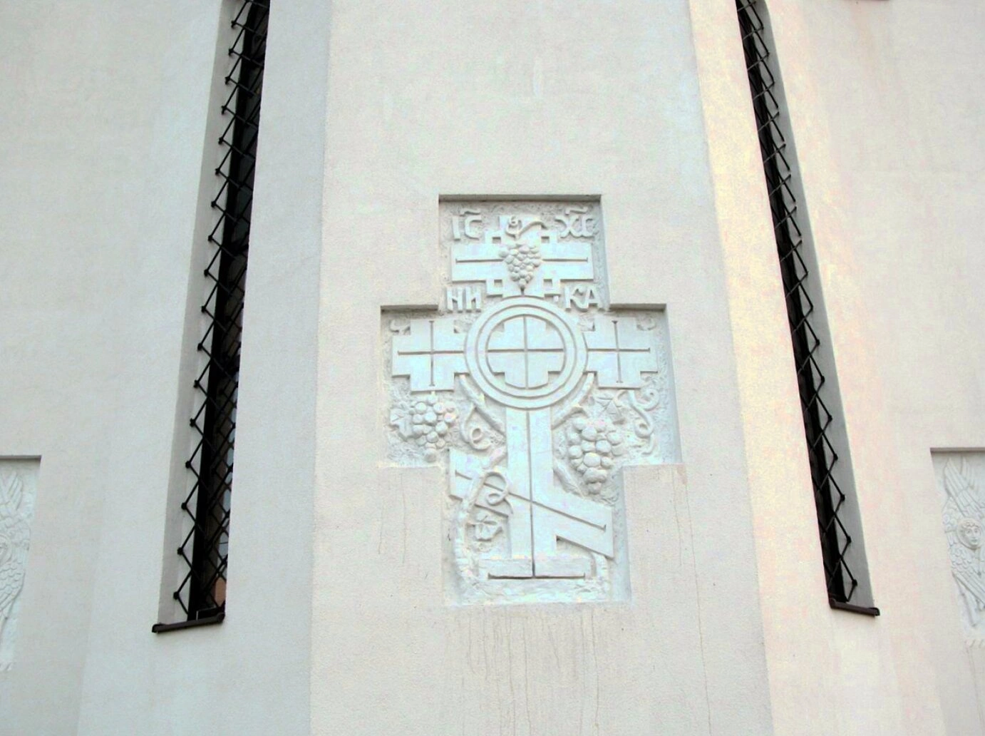 В верхней части рельефа размещена традиционная для византийской иконографии надпись «ІС ХС» - сокращенное обозначение имени Иисуса Христа, а непосредственно под ней слово «НИКА», что означает «Победа» и символизирует победу Спасителя над смертью. В нижней части композиции расположены орудия Страстей Христовых - копье, которым пронзили ребро Спасителя, и трость с губкой, пропитанной уксусом.