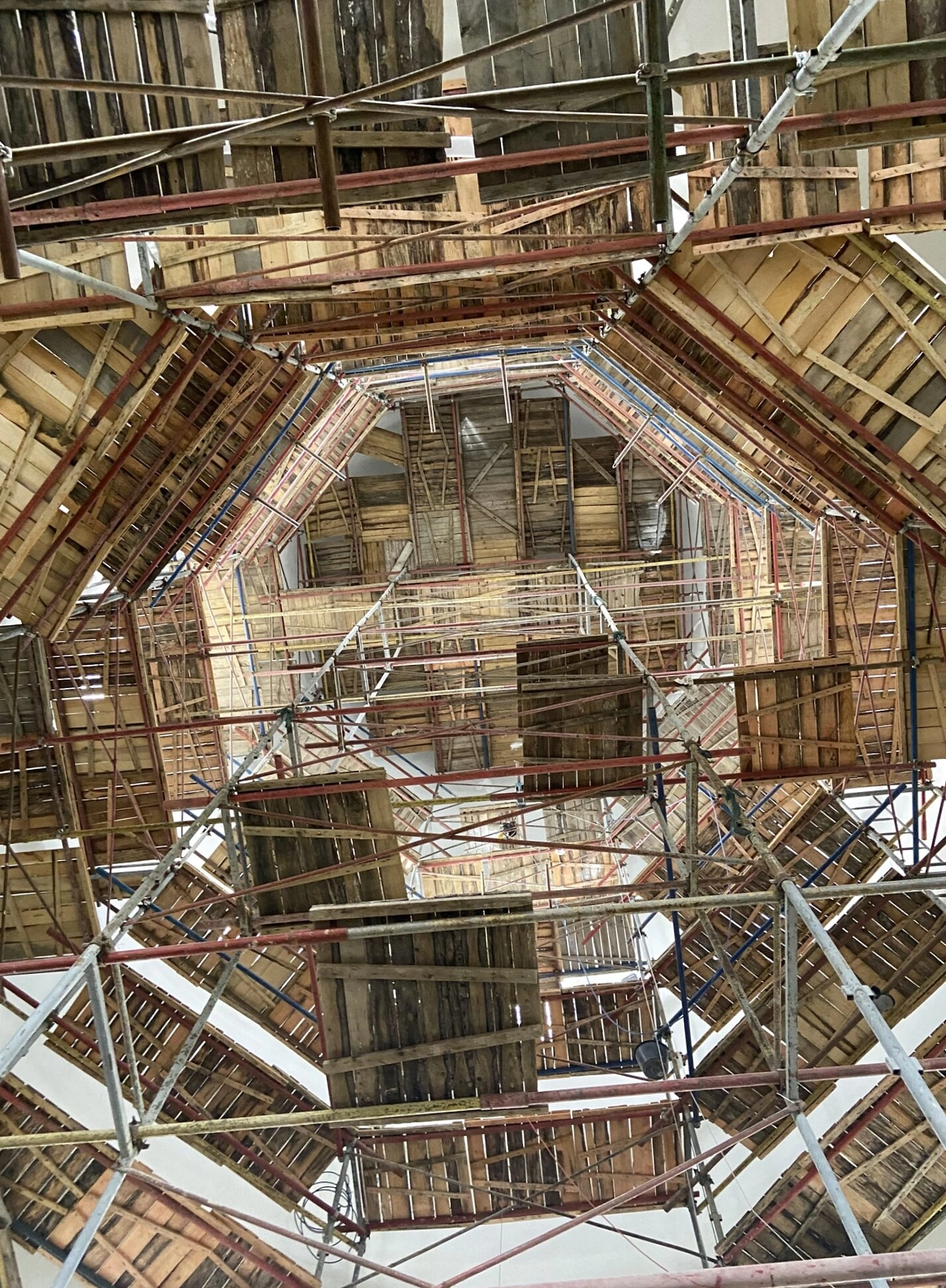 На представленной фотографии запечатлён ключевой этап реставрационных работ, проводимых внутри храма Казанской иконы Божией Матери, что расположен в селе Горбово Рузского городского округа Московской области. Снимок демонстрирует сложную систему строительных лесов, смонтированных под сводами церкви для обеспечения доступа мастеров к росписям и конструкциям на значительной высоте.