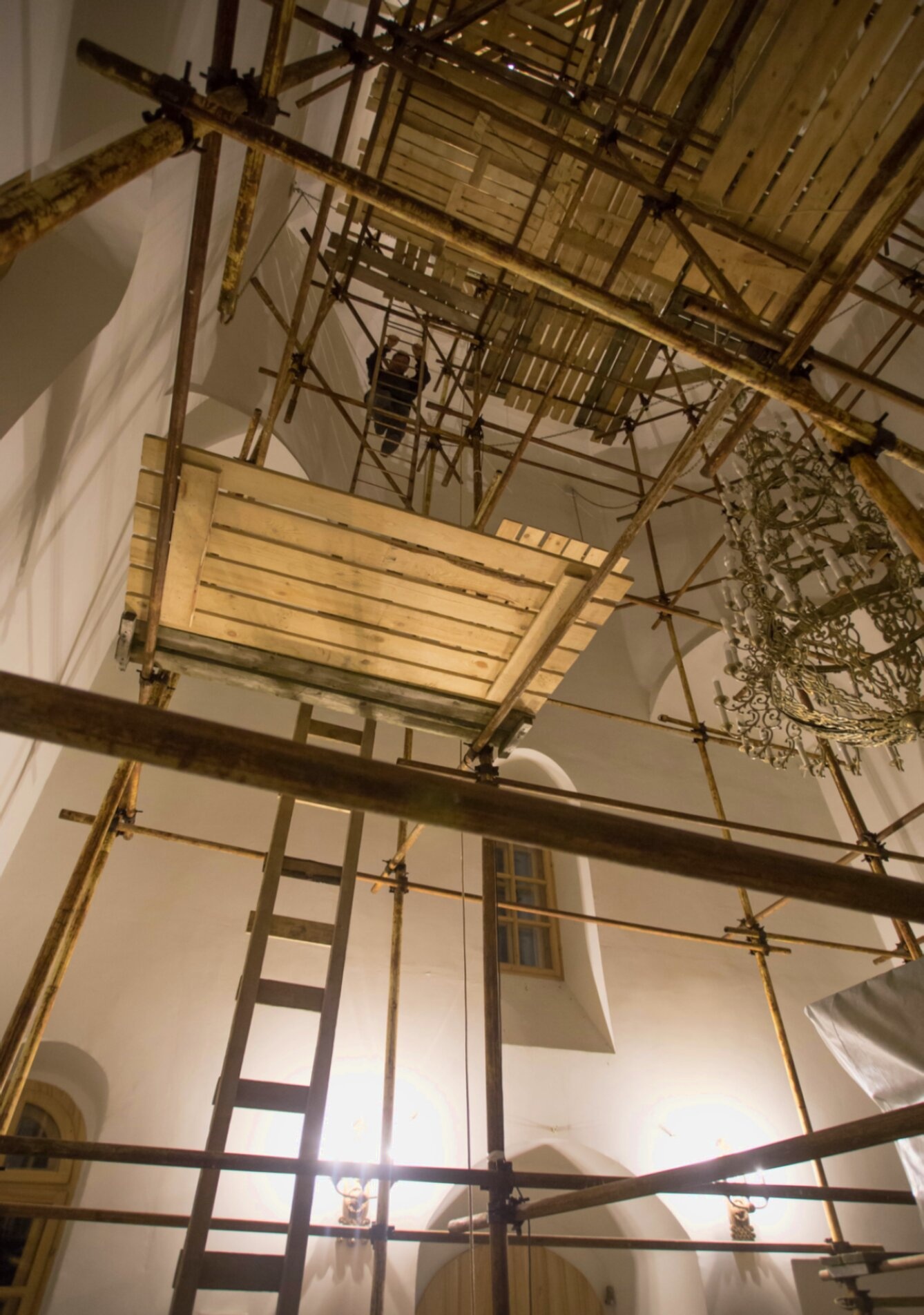 В верхней части фотографии можно различить старинную храмовую люстру, которая, несмотря на окружающие её строительные конструкции, продолжает символизировать духовный свет, просвещающий верующих. Присутствие человека на лесах подчёркивает ongoing характер реставрационных работ и человеческий труд, вкладываемый в сохранение православной святыни.