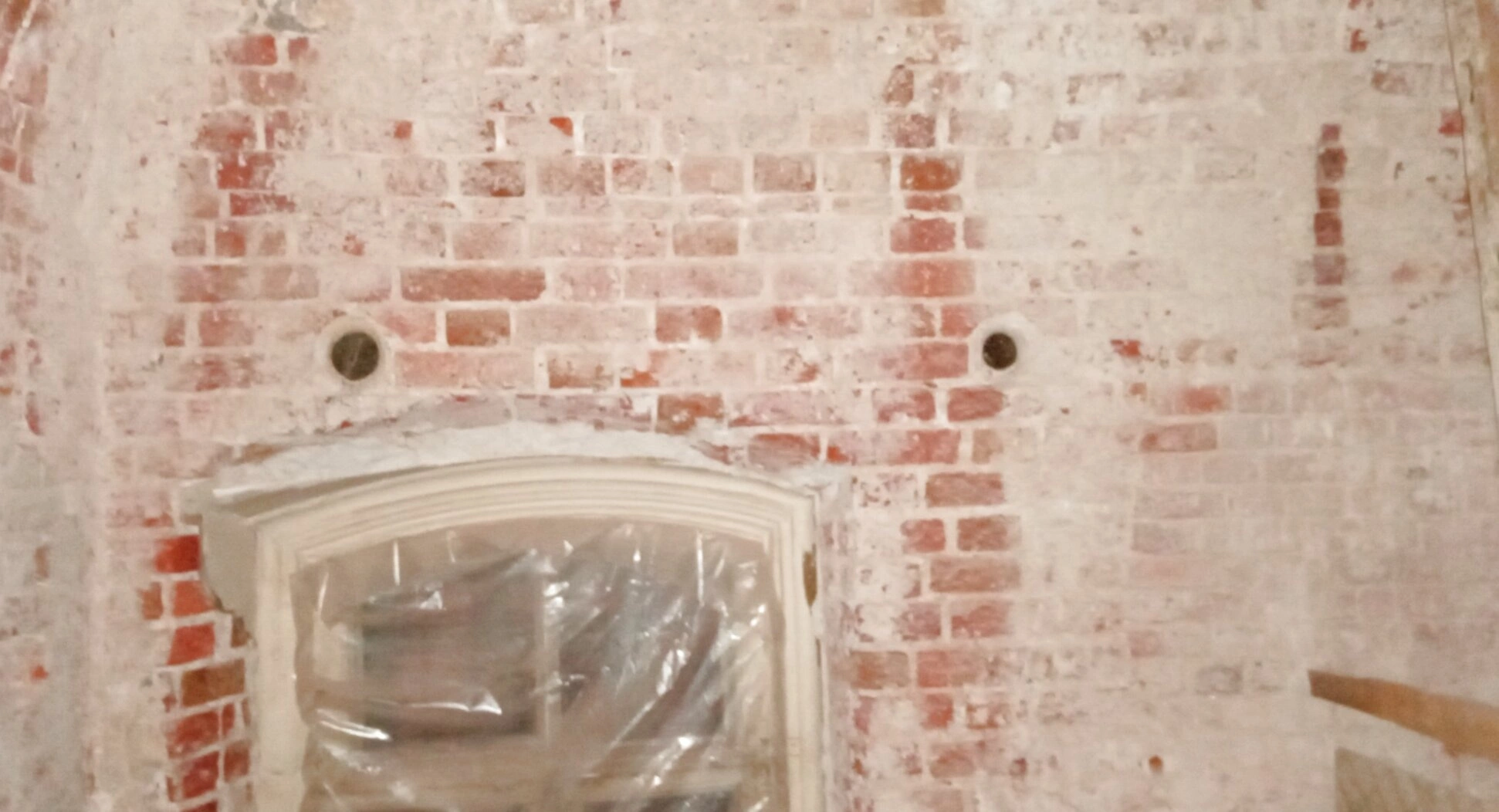 На представленном снимке запечатлен фрагмент внутренней стены храма святого пророка Божия Илии, что на Воронцовом поле в Москве, в период проведения реставрационных работ. Святыня, расположенная по координатам 55.753902, 37.654864, является объектом культурного наследия и в настоящее время проходит комплексное восстановление.