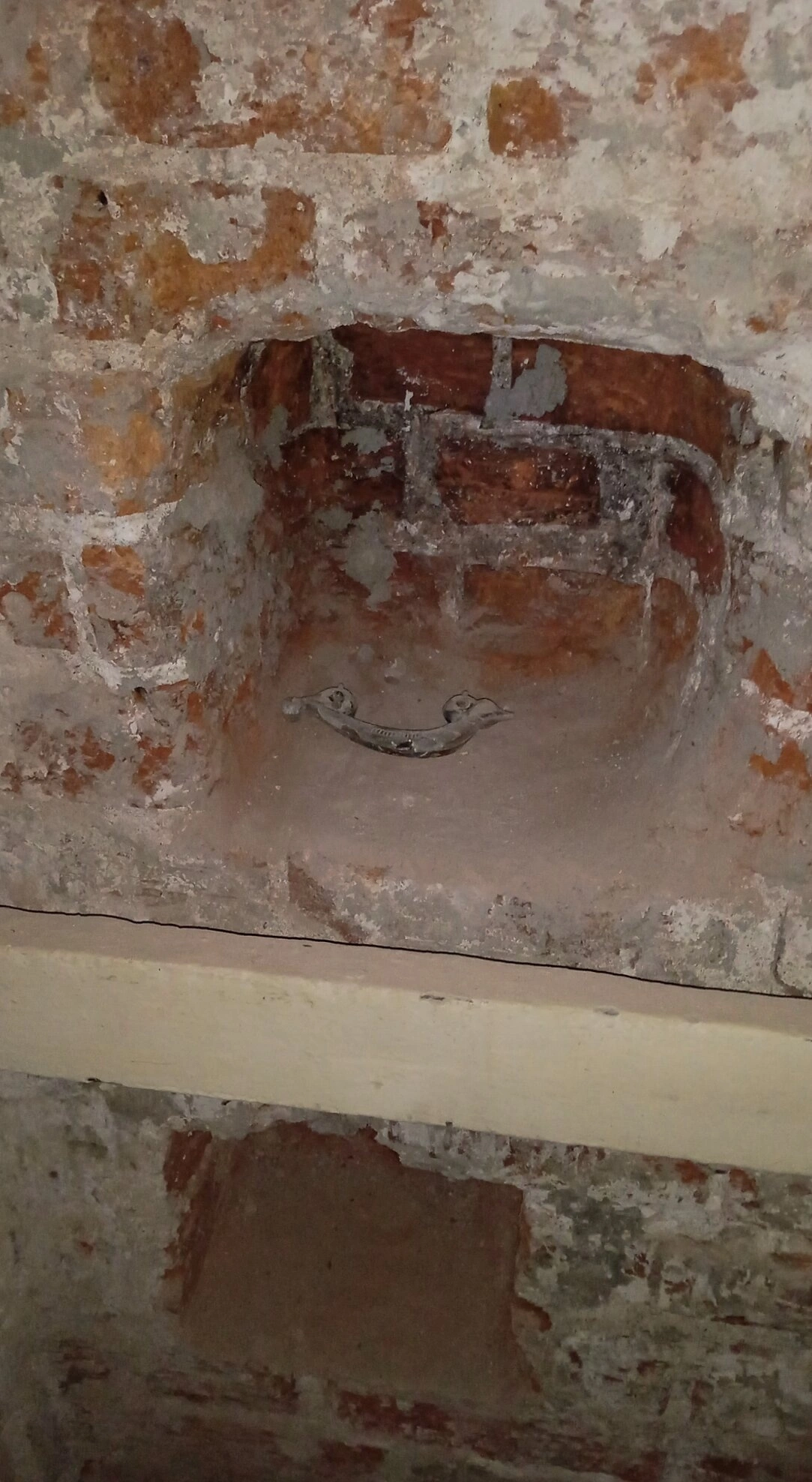 В глубине ниши просматривается металлическая скоба, возможно, являющаяся элементом исторической конструкции или свидетельством предыдущих ремонтных вмешательств. Стена демонстрирует следы времени: частично сохранившаяся штукатурка чередуется с открытыми участками кирпичной кладки, что позволяет оценить мастерство древних зодчих.