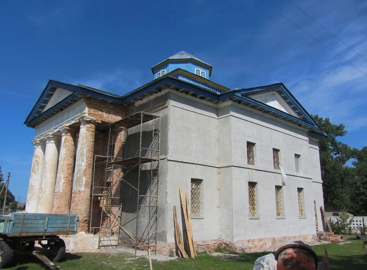 На представленной фотографии запечатлён исторический момент восстановления одного из православных храмов Беларуси — Церкви Святой Великомученицы Екатерины, расположенной в деревне Гадичево Добрушского района. Здание, возведённое в классическом архитектурном стиле, находится на активной стадии реставрации, о чём свидетельствуют установленные строительные леса на фасаде и частично открытая кирпичная кладка.