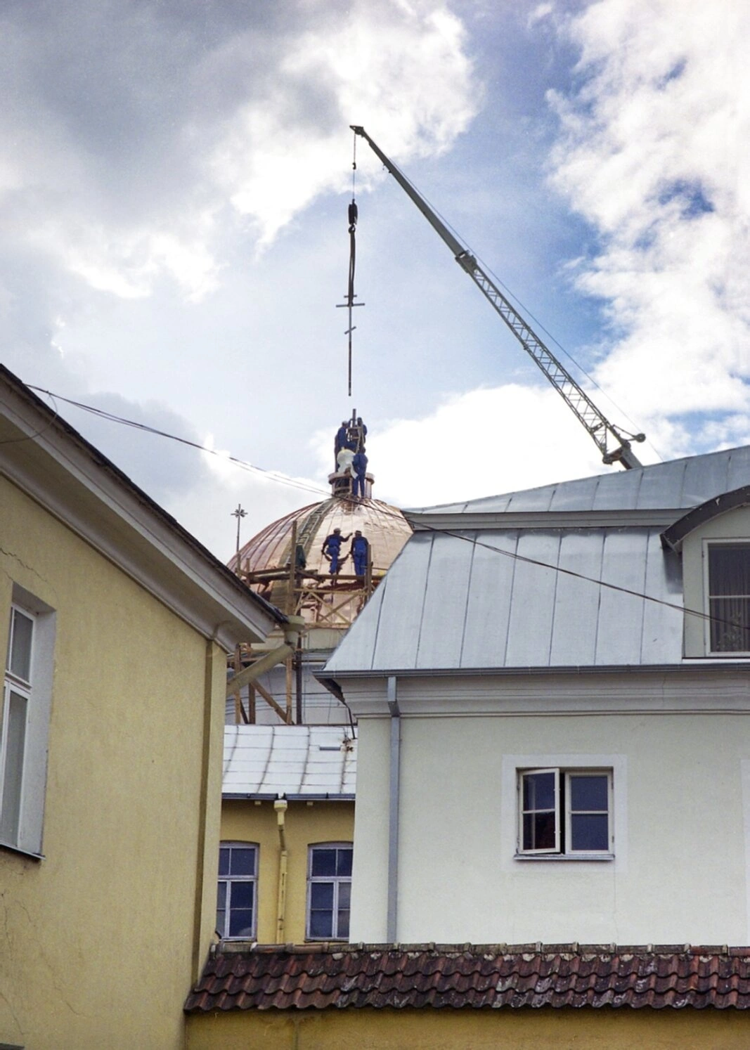 На представленной фотографии запечатлён ключевой момент реставрационных работ на главном куполе православного собора Святителя Николая Чудотворца (Николаевского собора) в Таллине. Масштабные работы ведутся на высоте, купол обители покрывается новыми металлическими листами, предположительно медными, которые со временем приобретут благородный зелёный патинированный оттенок. Несколько рабочих непосредственно на конструкции обеспечивают монтаж элементов.