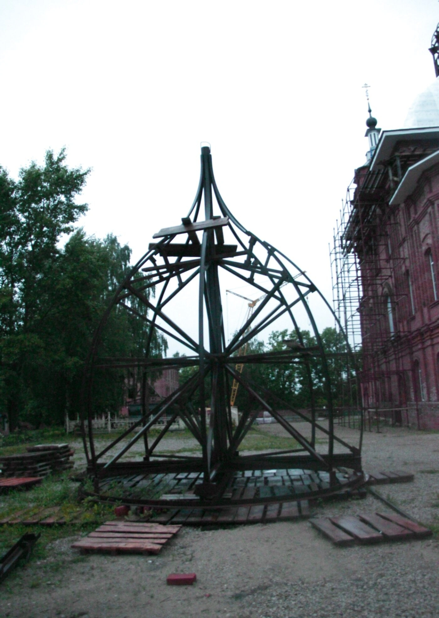 На фотографии запечатлён ключевой момент реставрационных работ в Свято-Лаврентьевом мужском монастыре города Калуги. На переднем плане изображён новый металлический каркас (глава) купола, предназначенный для установки на один из храмов монастырского комплекса. Рядом с конструкцией аккуратно сложены деревянные поддоны и необходимые строительные материалы, что свидетельствует о активной фазе благоустроительных работ.