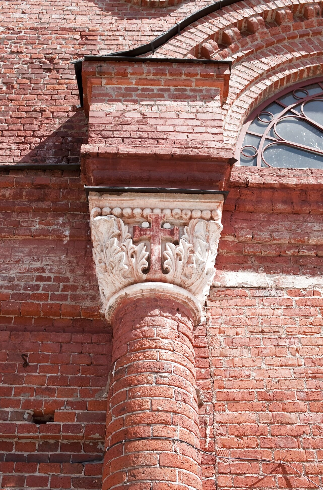 За колонной видны мощные стены из красного кирпича и арочный проём, характерный для храмовой архитектуры. Собор, в котором была сделана фотография, был возведён в начале XX века в неорусском стиле и является одним из ключевых храмов обители. Монастырь, расположенный в городе Хотьково Сергиево-Посадского района, имеет богатейшую историю, восходящую к XIV столетию, и известен как место упокоения святых родителей Преподобного Сергия Радонежского — преподобных Кирилла и Марии.