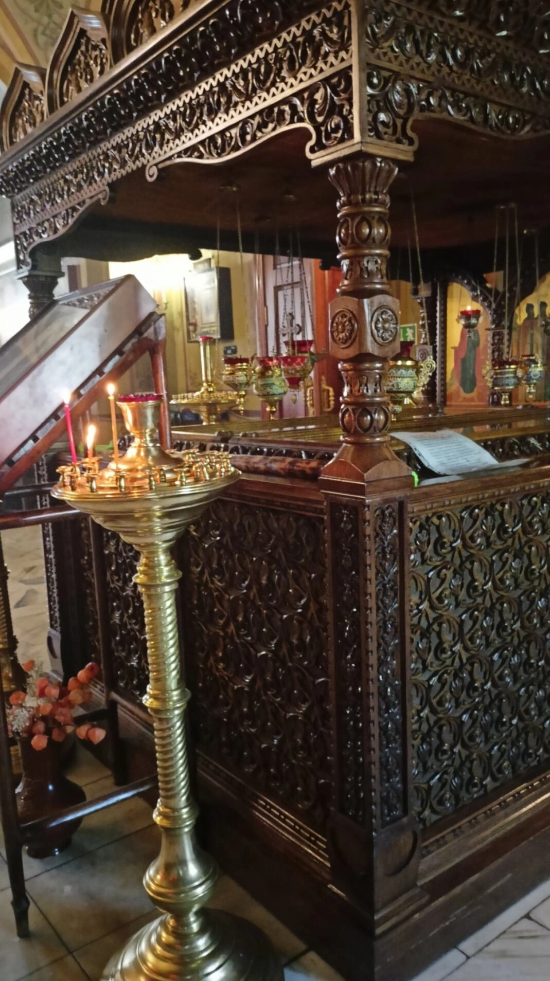 Сень выполнена в традициях русского церковного искусства с использованием сложных резных орнаментов и религиозной символики. Подобные сооружения в православных храмах символизируют горний мир и устанавливаются над наиболее значимыми святынями. Богатое убранство кивория свидетельствует о особом почитании этого места, где совершается центральное таинство Евхаристии.