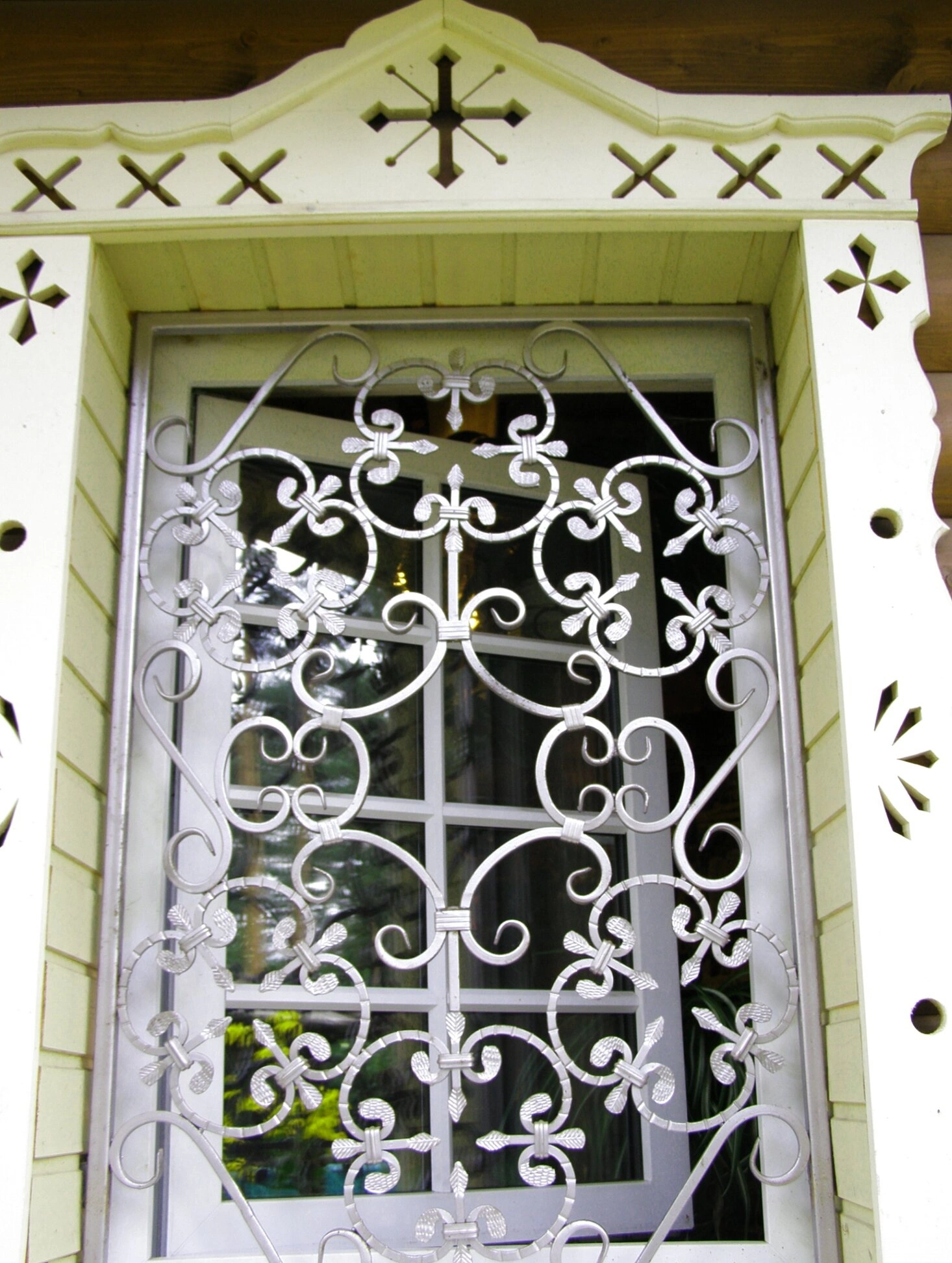 На представленной фотографии запечатлено одно из окон церкви Казанской иконы Божией Матери, что в поселке Вырица Ленинградской области. Окно украшено ажурной кованой решеткой, выполняющей как защитную, так и декоративную функцию. Оконный проем обрамлен великолепными резными деревянными элементами, искусно исполненными мастерами-древоделами. Узор включает в себя традиционные крестообразные мотивы, символизирующие спасение и искупительную жертву Христа.