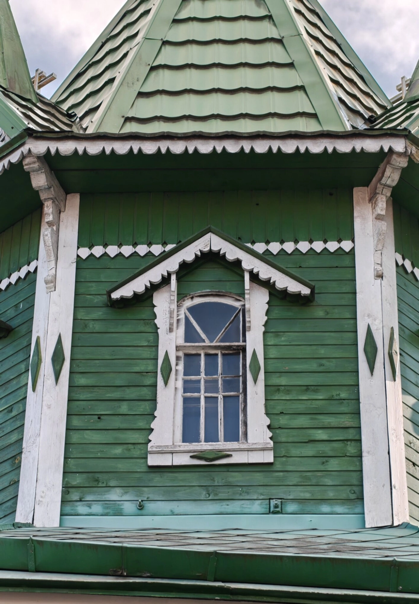 Наличник, окрашенный в чистый белый цвет, эффектно выделяется на фоне зелёной стены храма. Его сложный профиль и богатый орнамент свидетельствуют о высоком мастерстве безвестных плотников, посвятивших свой труд украшению Дома Божия. Подобный декор не только обладает несомненной эстетической ценностью, но и несёт сакральный смысл, будучи призванным охранять духовное пространство храма от всего суетного.