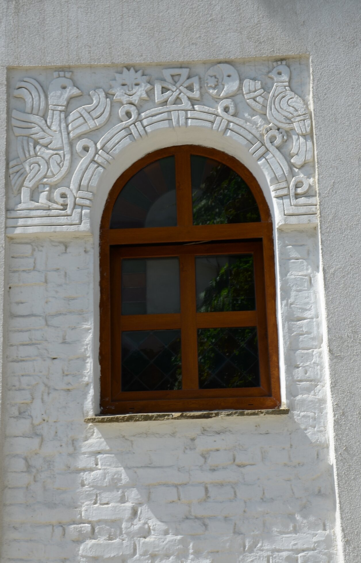 Особого внимания заслуживает резной декор, обрамляющий оконный проём. В верхней правой части размещён особенно насыщенный орнамент, выполненный непосредственно по каменной поверхности или штукатурке. Художественная резьба демонстрирует элементы, восходящие к древнерусским и византийским традициям, с изображением стилизованных растительных композиций и, возможно, символических образов Божьих творений.
