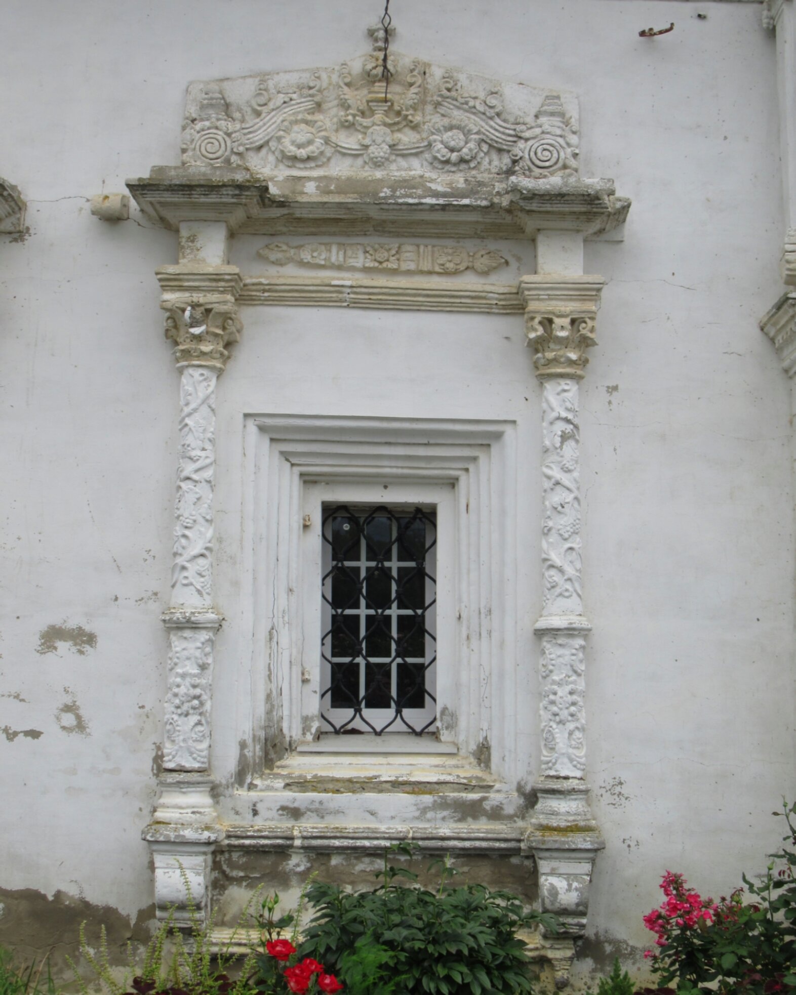 Центральным элементом композиции является оконный проём, обрамлённый пышным резным наличником. По бокам его украшают декорированные колонны с искусно выполненными капителями. Завершает композицию надоконный фронтон сложной, витиеватой формы, обильно украшенный лепными элементами, характерными для барочного стиля в русском церковном зодчестве. Окно защищено прочной кованой решёткой, собранной из квадратных ячеек, что не только служит элементом безопасности, но и дополняет эстетическое восприятие, подчёркивая основательность и монументальность храмовой постройки.