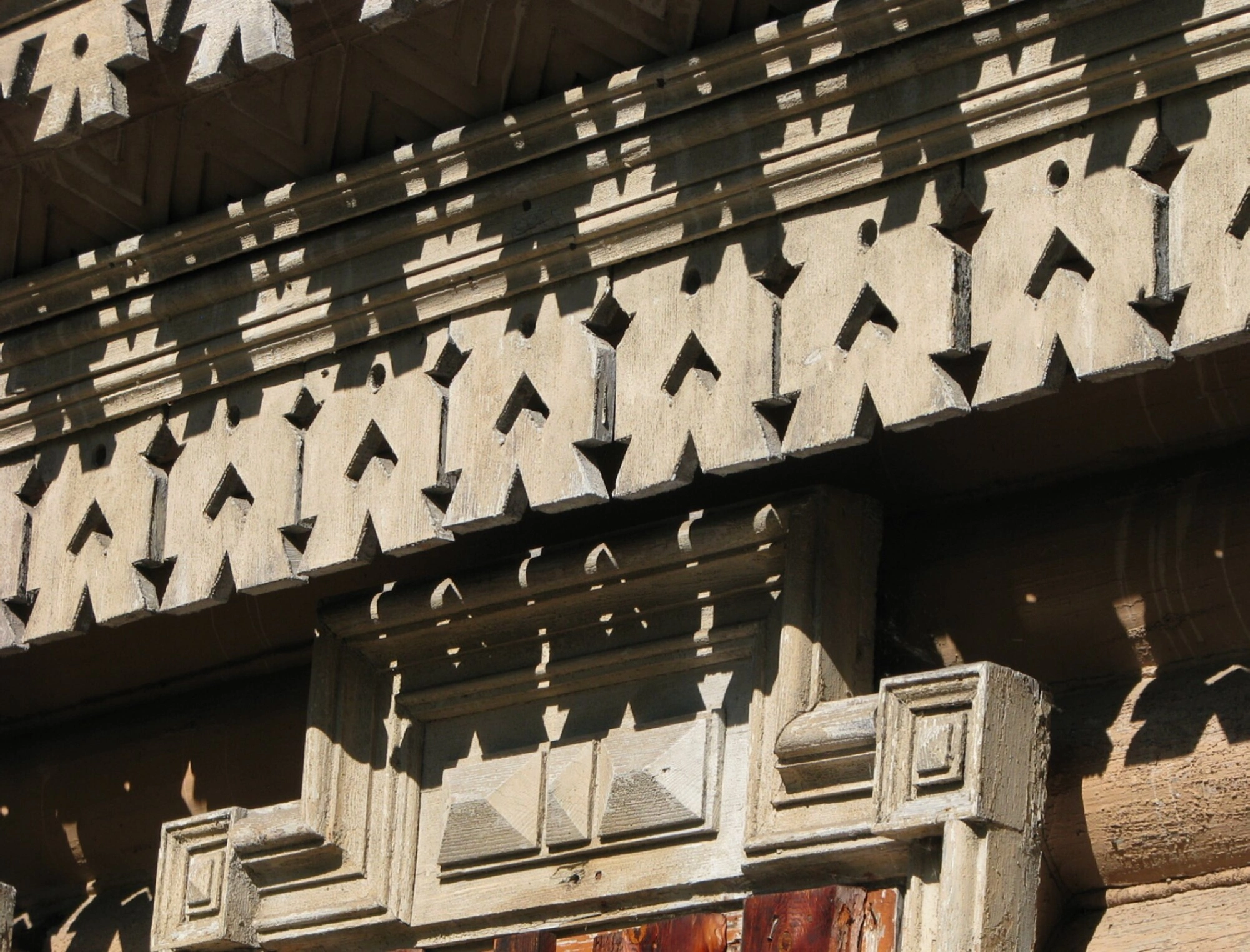 Наличник окна демонстрирует сложную геометрию с квадратными выступами, украшенными рельефным узором. Деревянные элементы, судя по внешнему виду, были покрыты светлой краской или известью, что соответствовало традициям оформления православных храмов. На поверхности декора заметны следы времени, однако это лишь подчёркивает историческую ценность памятника и благородную патину лет.